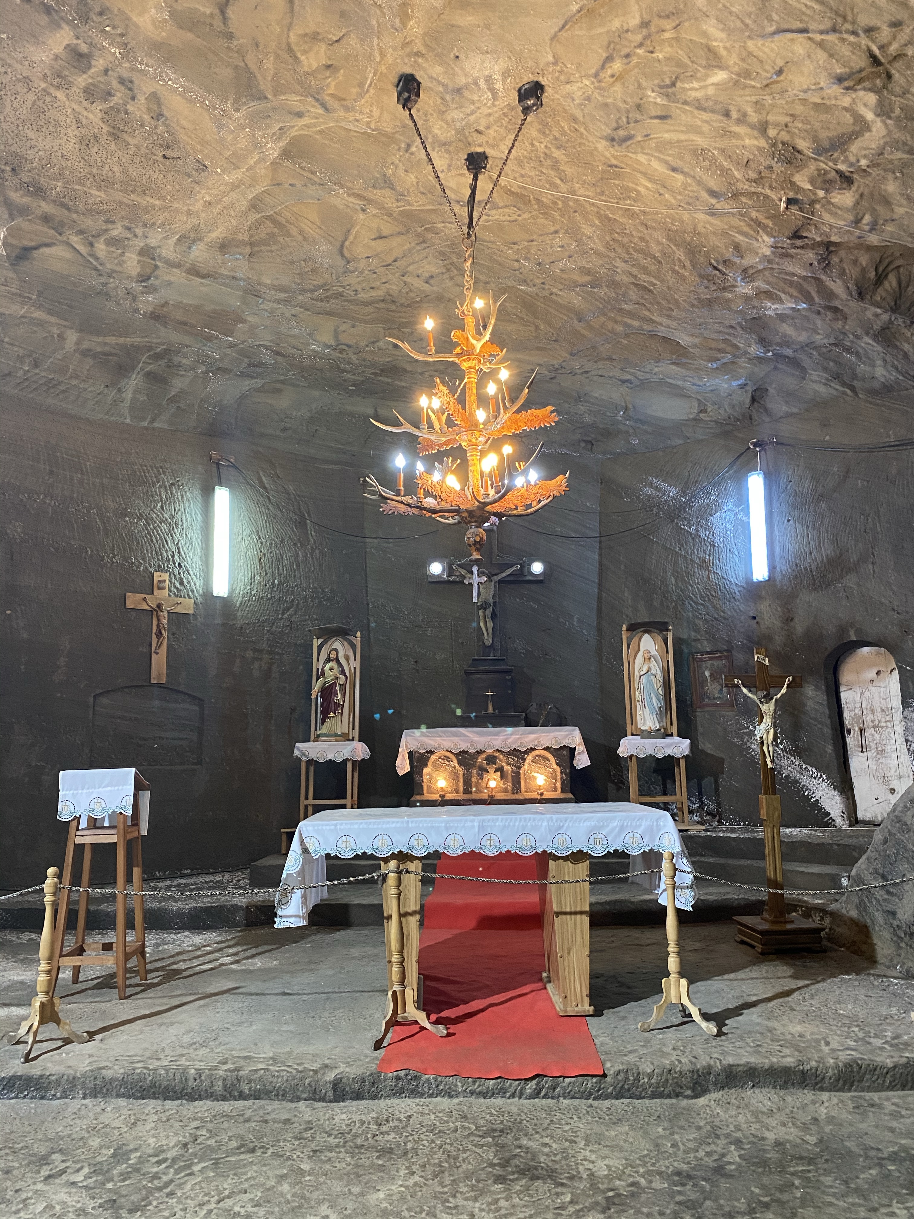 私たちが訪れたのは、Casica mine (カチカ鉱山)という、現在も稼働中の塩鉱山です。現役と言うことで、洞窟内はガソリン臭で満ちているので、小さいお子さん連れだとなかなか厳しいかもしれません。マスクを付けていたので、いくらか軽減されますが、それでもかなり強い匂いなのでご注意を。急な階段をひたすら地下に降りていく途中、壁に塩の結晶があったり、岩を削って彫刻が施されていたり、期待度が高まります。洞窟内は温度が低いので夏場であってもカーディガンやジャケットなどを持っていた方がいいかもしれません。採掘場ではありますが、祈りのための大きな祭壇があったり、フットサル場やダンスホール、小さな博物館も有していて、日本の金山などとは違った面白さがありした。その後近くのレストランでランチを取り、目的地へ移動します。