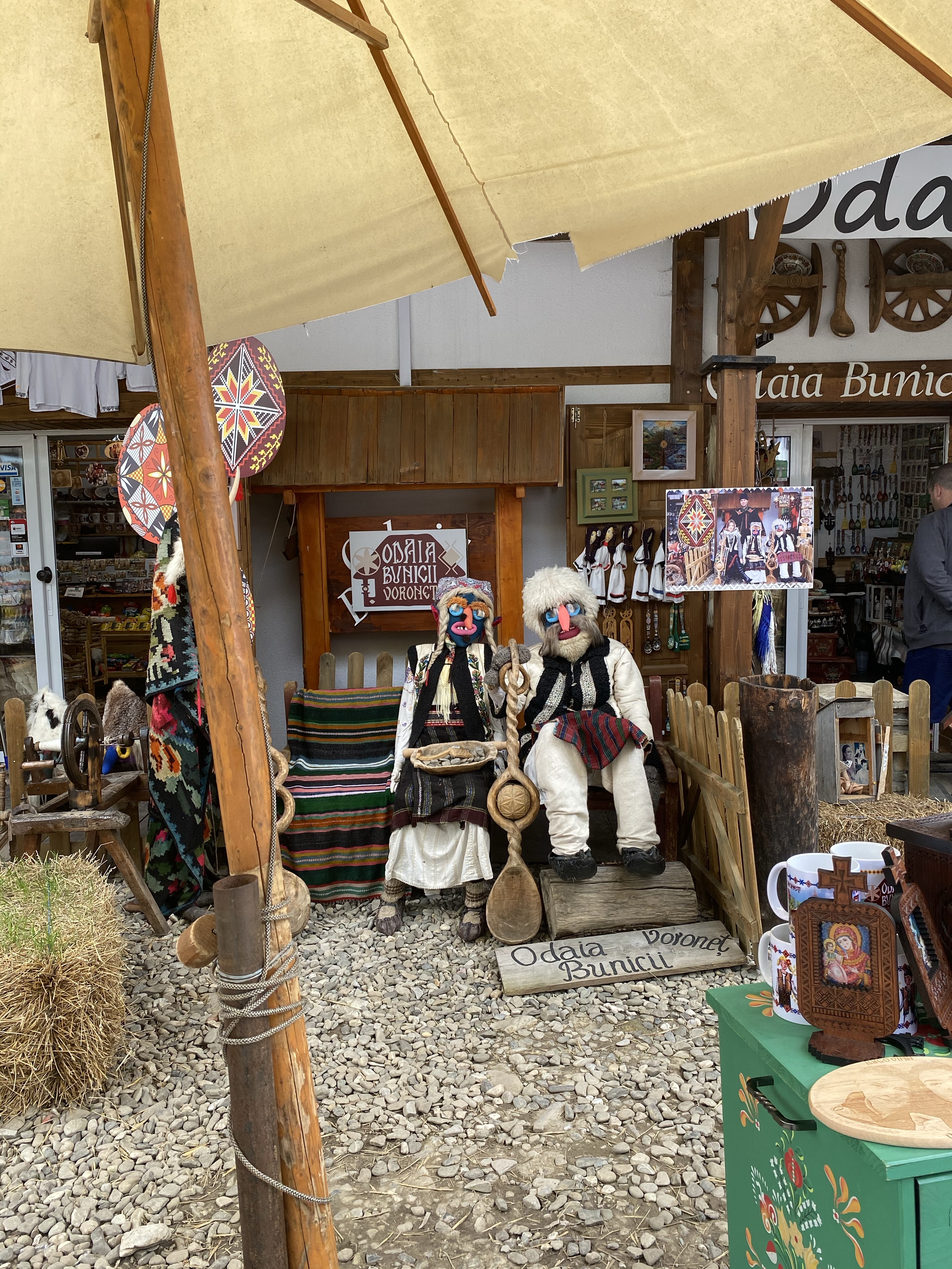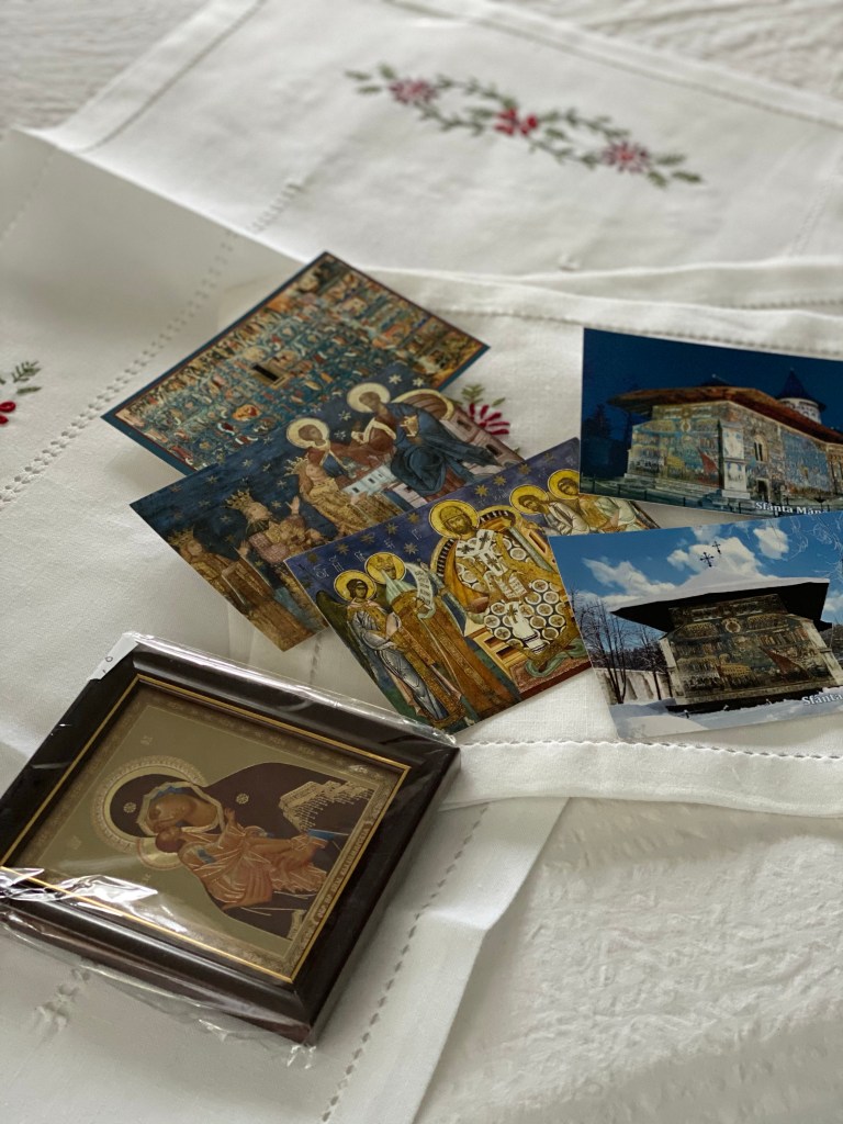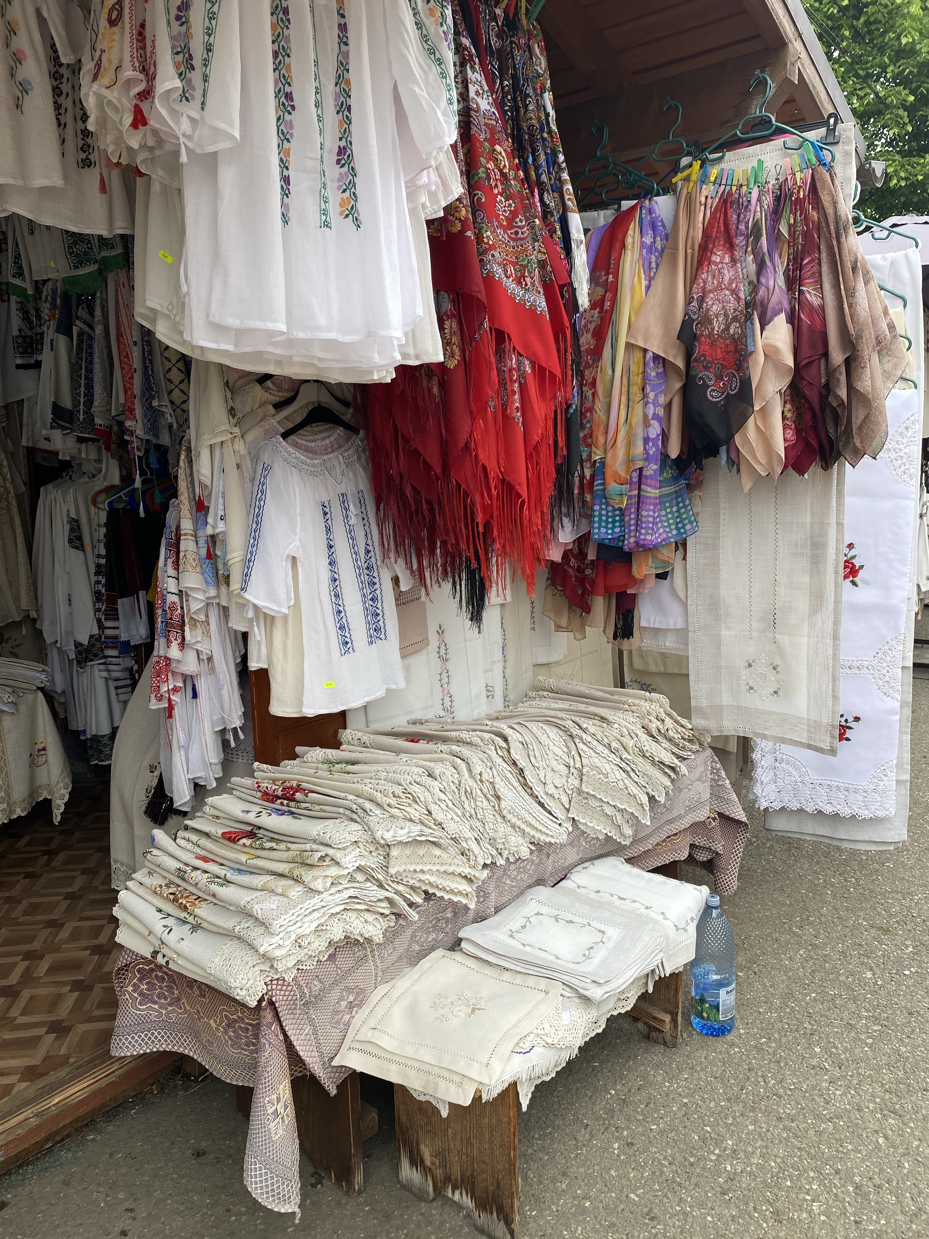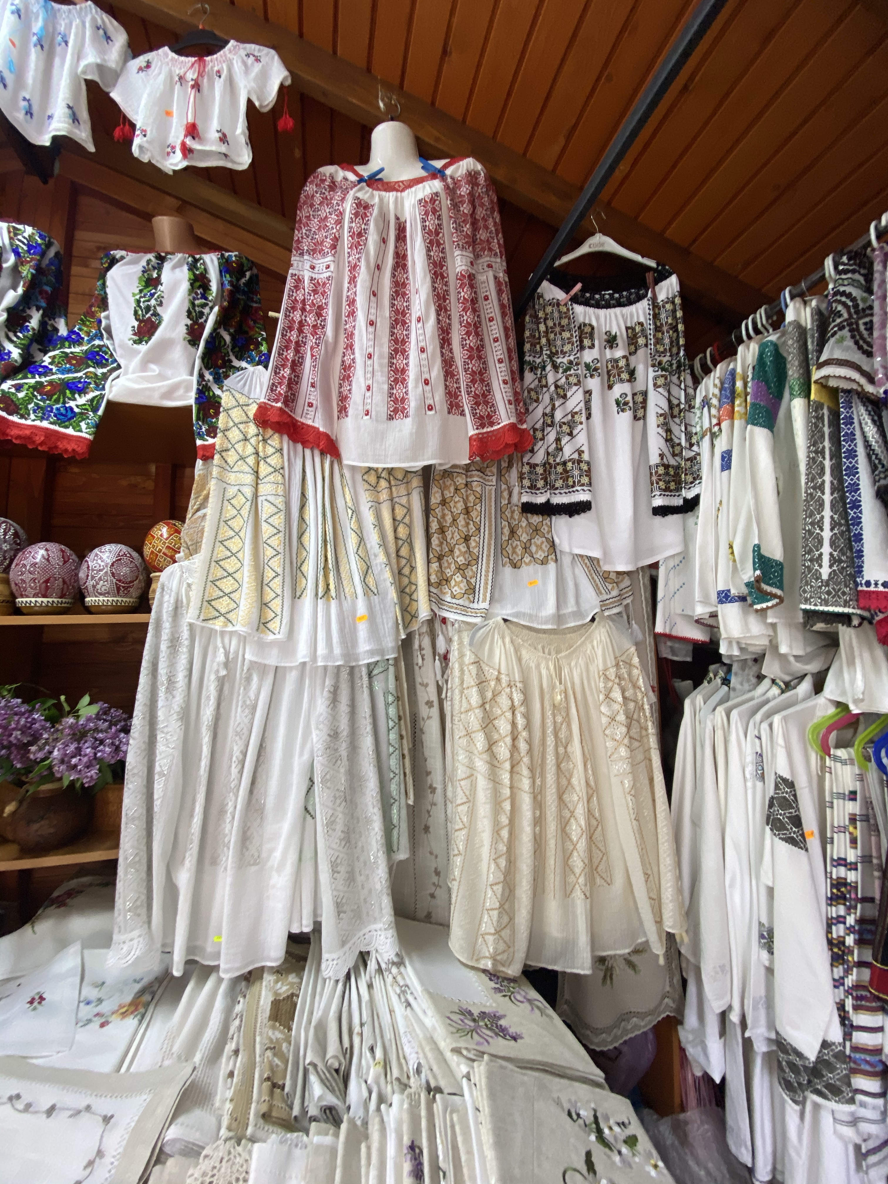 駐車場への道すがら、かわいい刺繍製品を並べているお店があり、店先では高齢のオーナーが実際に刺繍を施していらっしゃいました。ブコヴィナ地方では、こういった手作業の刺繍製品、特にルーマニアの民族衣装・ie(イエ)が有名です。今でも村々の女性は手作業で刺繍を施しているそうで、お土産屋さんやローカルマーケットなどに並んでいます。ただし、手作業の商品は日本円でもゆうに一万円を超える商品がほとんどで、安価な中国製も出回っているので購入時は注意が必要です。私も手作業のものが欲しかったのですが、今回はテーブルランナーとテーブルマットを購入しました。クリスマスやイースターなど、特別な日に使いたいと思います。