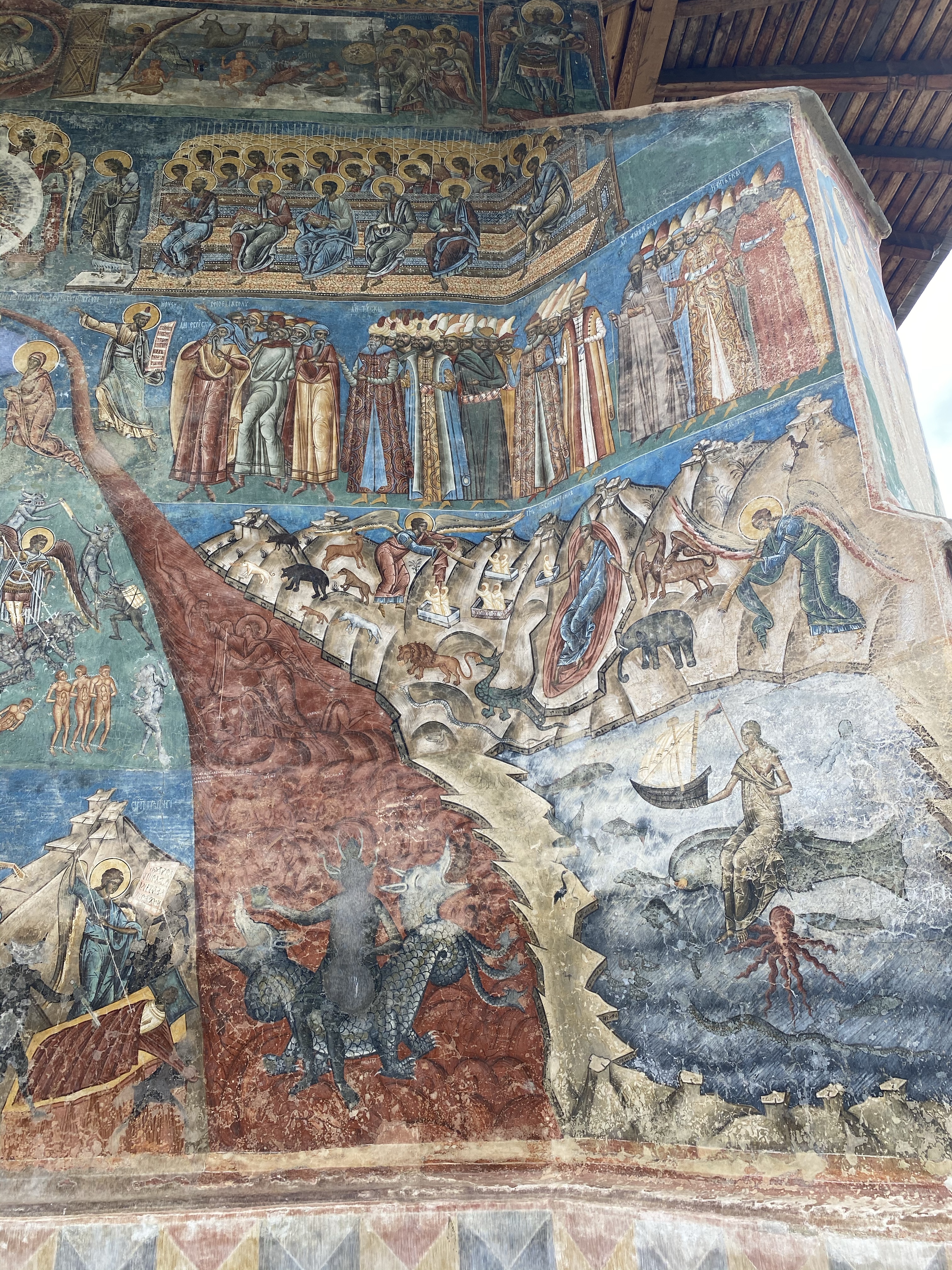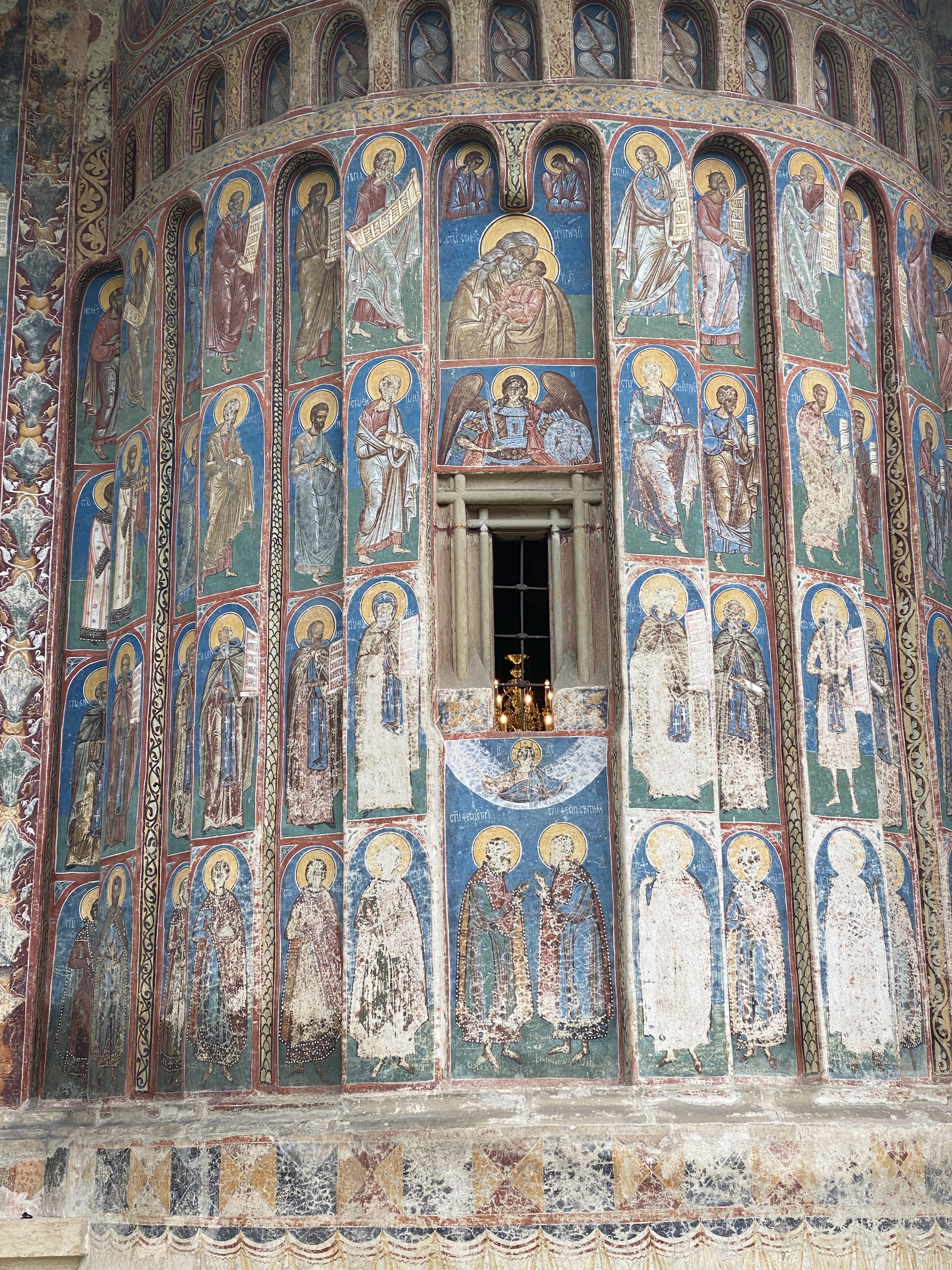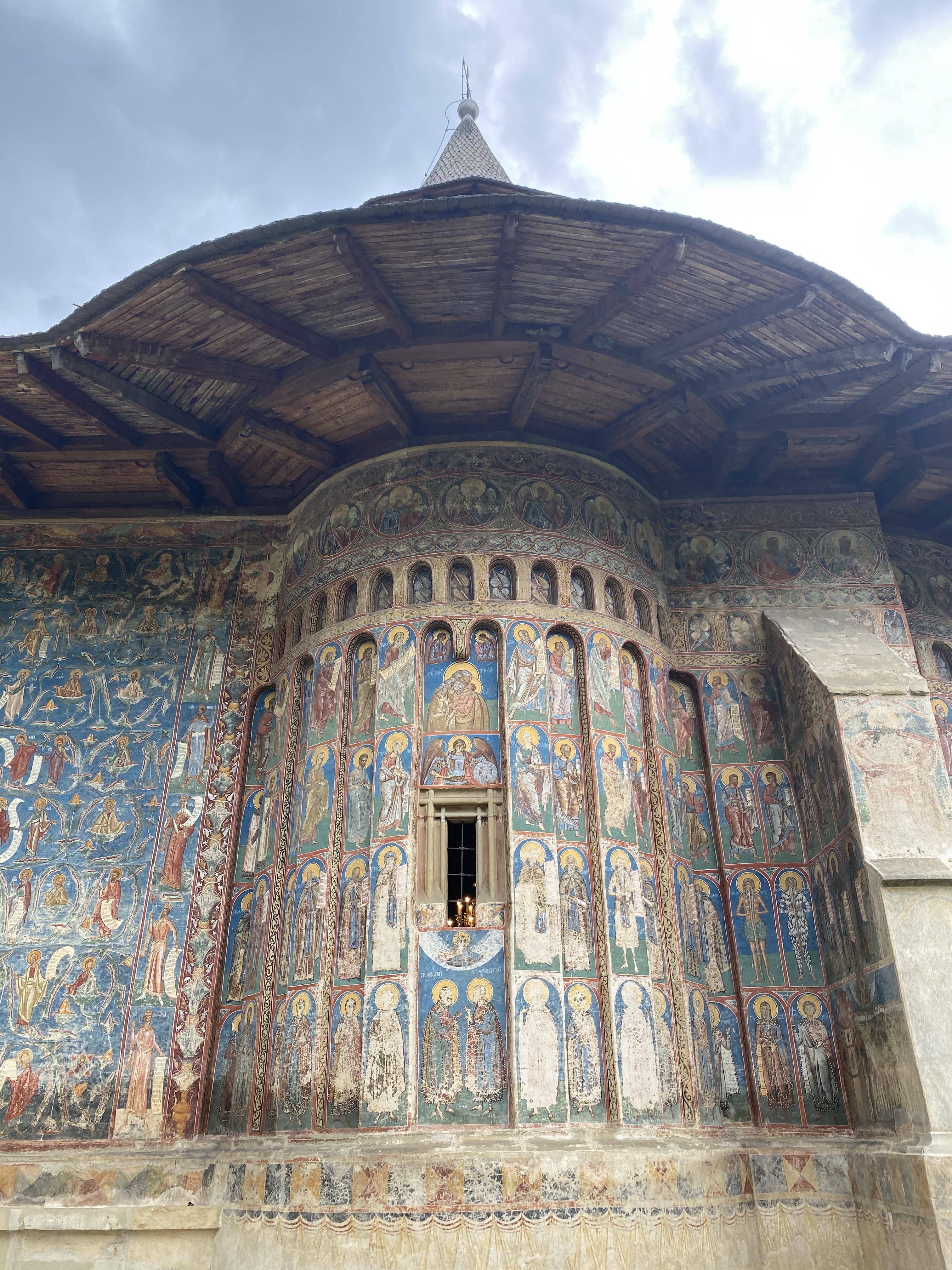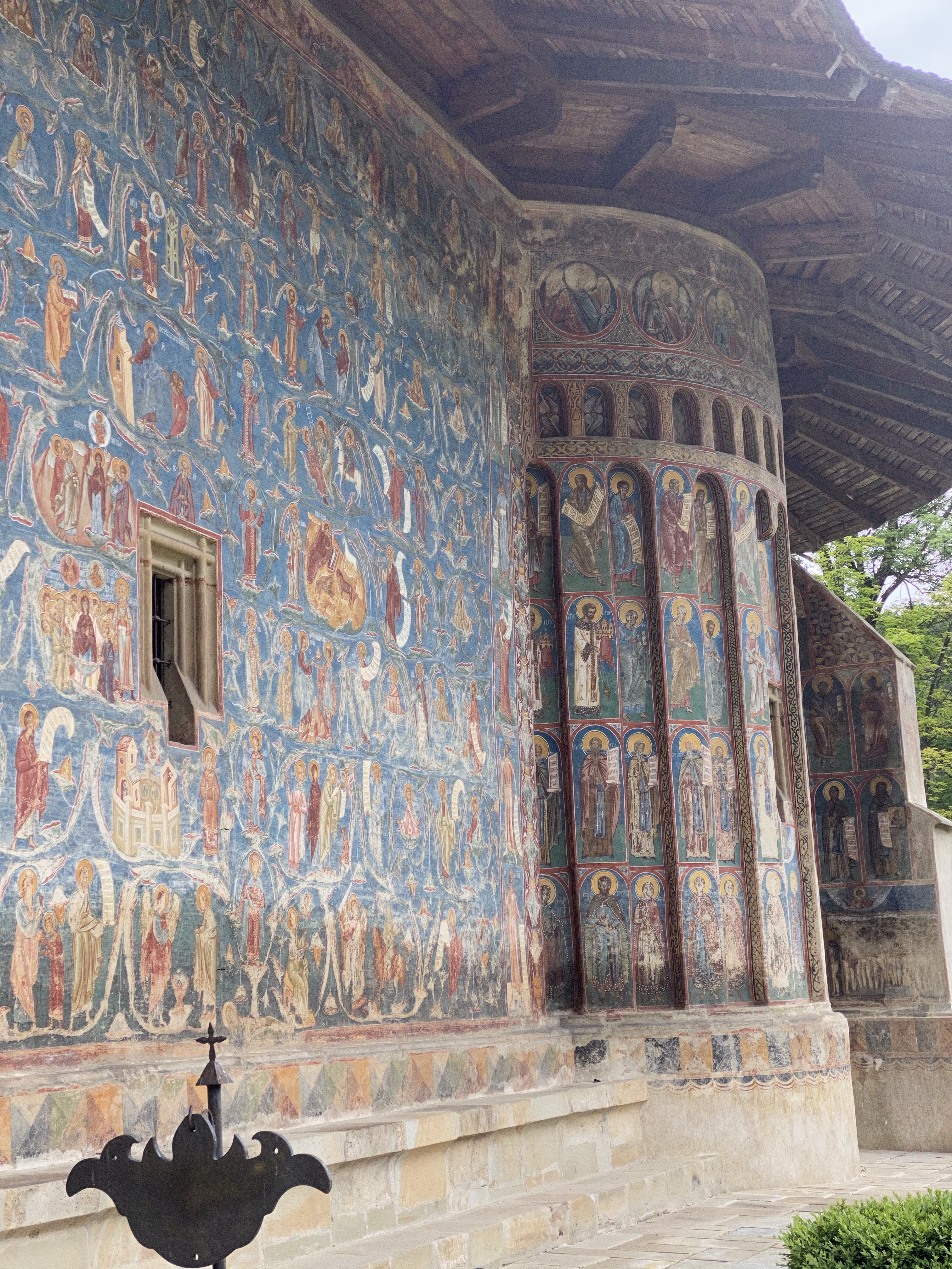 Voronet Monastery は、1488年に建てられたと言われており、中世のモルドヴァを代表する建築と高い評価を得ています。修道院の近くには、広い駐車場があり、そこから参道のように土産物屋さんが軒を連ねる通りを抜けると、修道院にたどり着きます。徒歩5分程度の道のりです。修道院は、防衛面もあり高い塀で囲まれています。彫刻が施された大きな木の扉を抜けると、真っ先に目に飛び込んできたのが、敷地内の中心に建てられた聖堂(教会堂)です。決して大きくはありませんが、壁一面に青をベースにしたフレスコ画が施されており、圧倒的な存在感を醸しだしていました。入り口から正面の壁は、服装や装飾が異なる聖人が無数に描かれており、床上から軒下まで、細やかな図柄が一面に書き込まれています。ちなみに、ベースとなっている青色は、現代科学でも解明できないと言われているそうで、”Voronet Blue”と呼ばれているのだとか。壁画は経年の風雨により一部は判別できない状態ではありますが、ラピスブルーのように濃い色の場所もあり、ドリーミーな装飾も相まって、なんとも神秘的です。まずは一周ぐるりと壁画を堪能しました。東西南北の壁に描かれている図柄は一様ではなく、入り口から入った正面は聖人一人一人の肖像、裏側は儀式や天国と地獄をモチーフにした構図で意味はわからなくとも圧倒される美しさ。