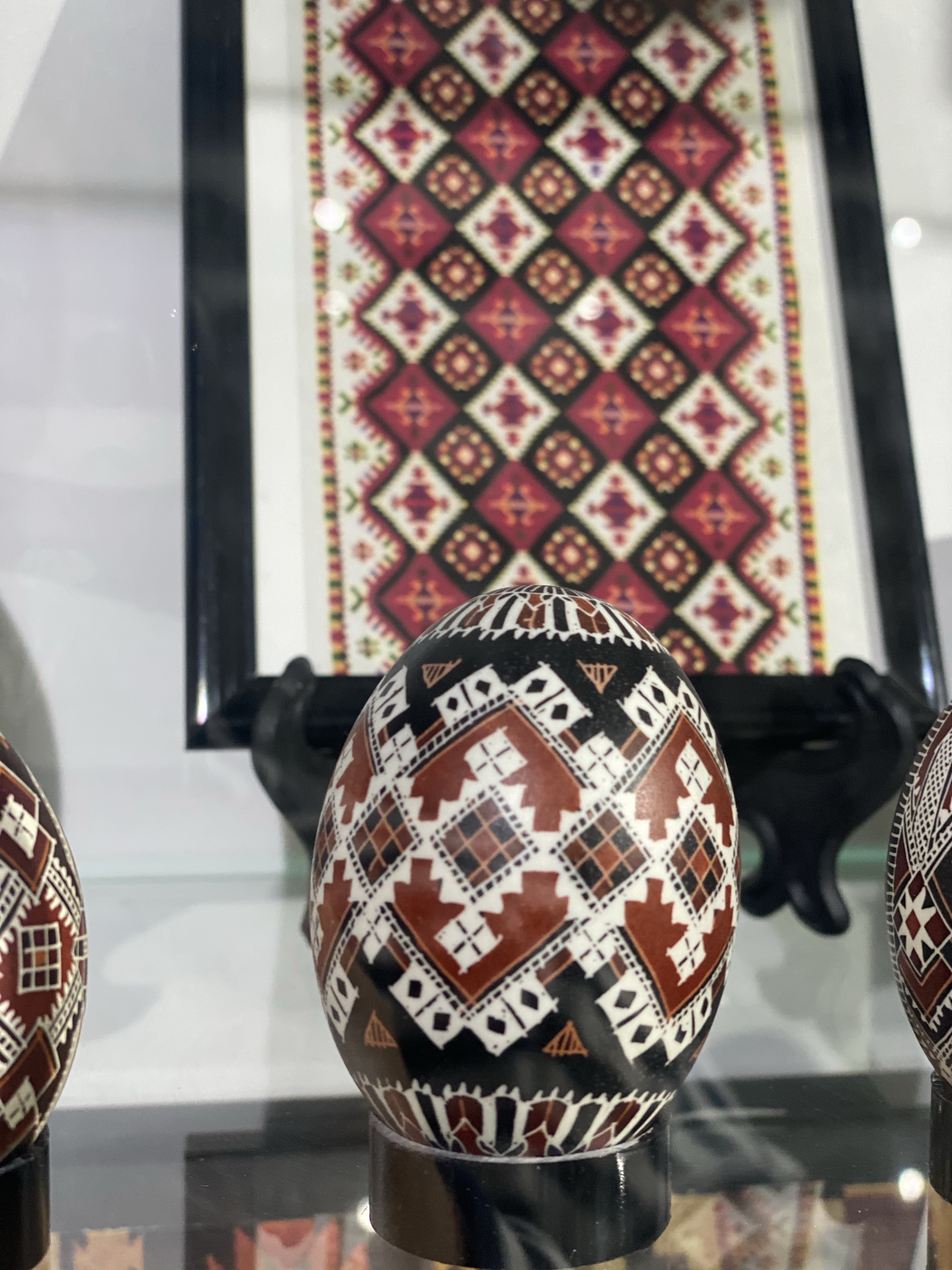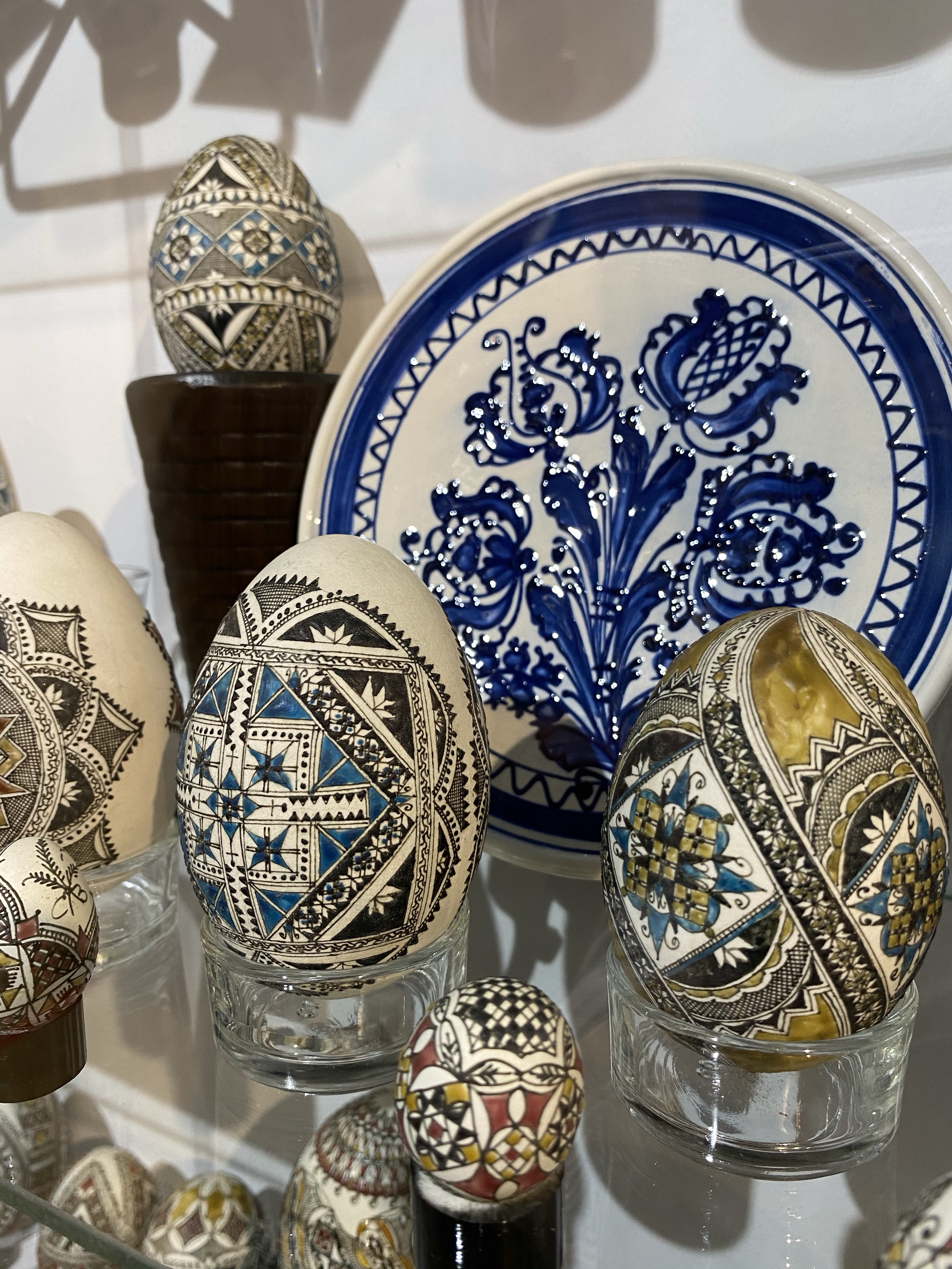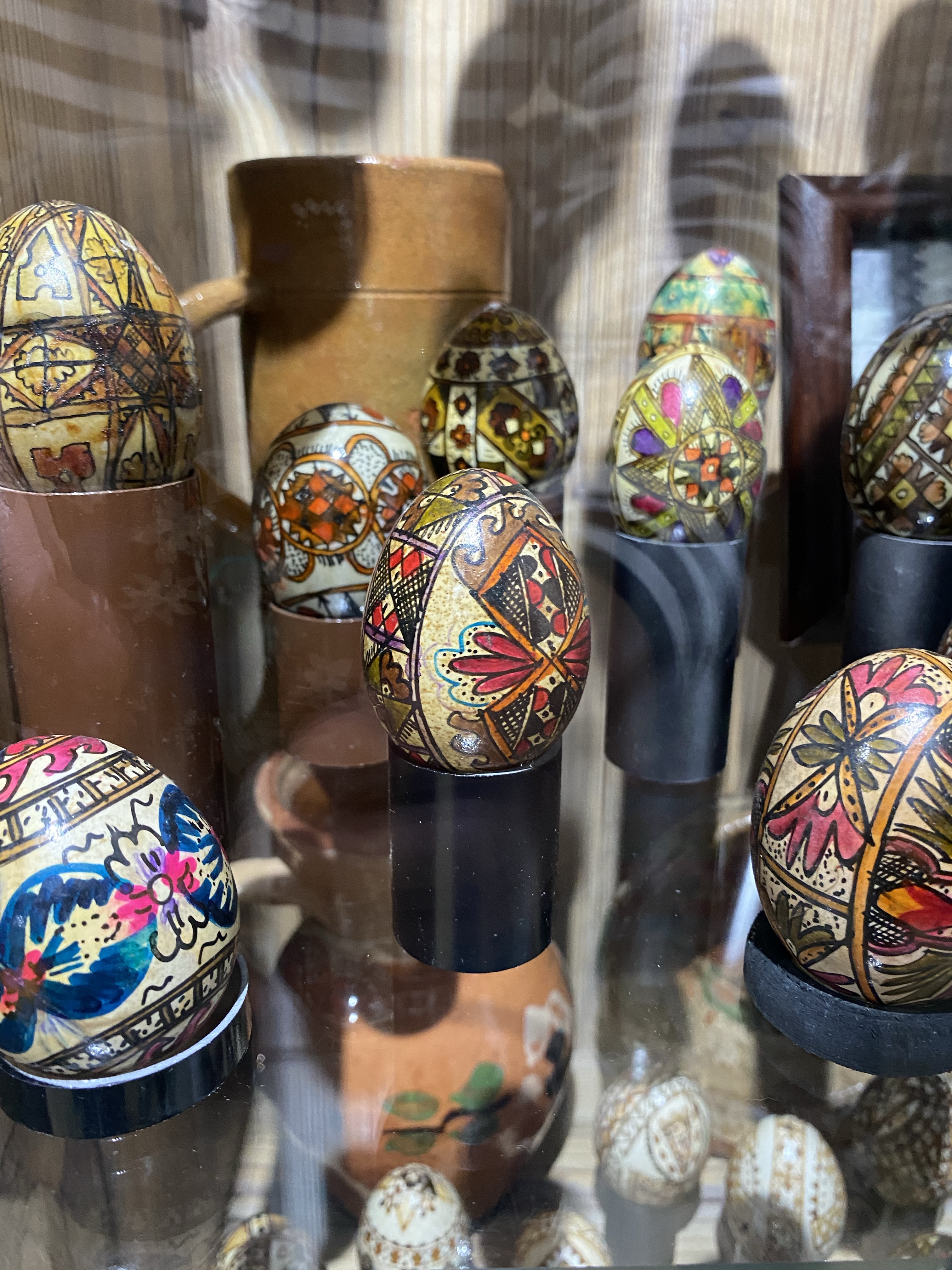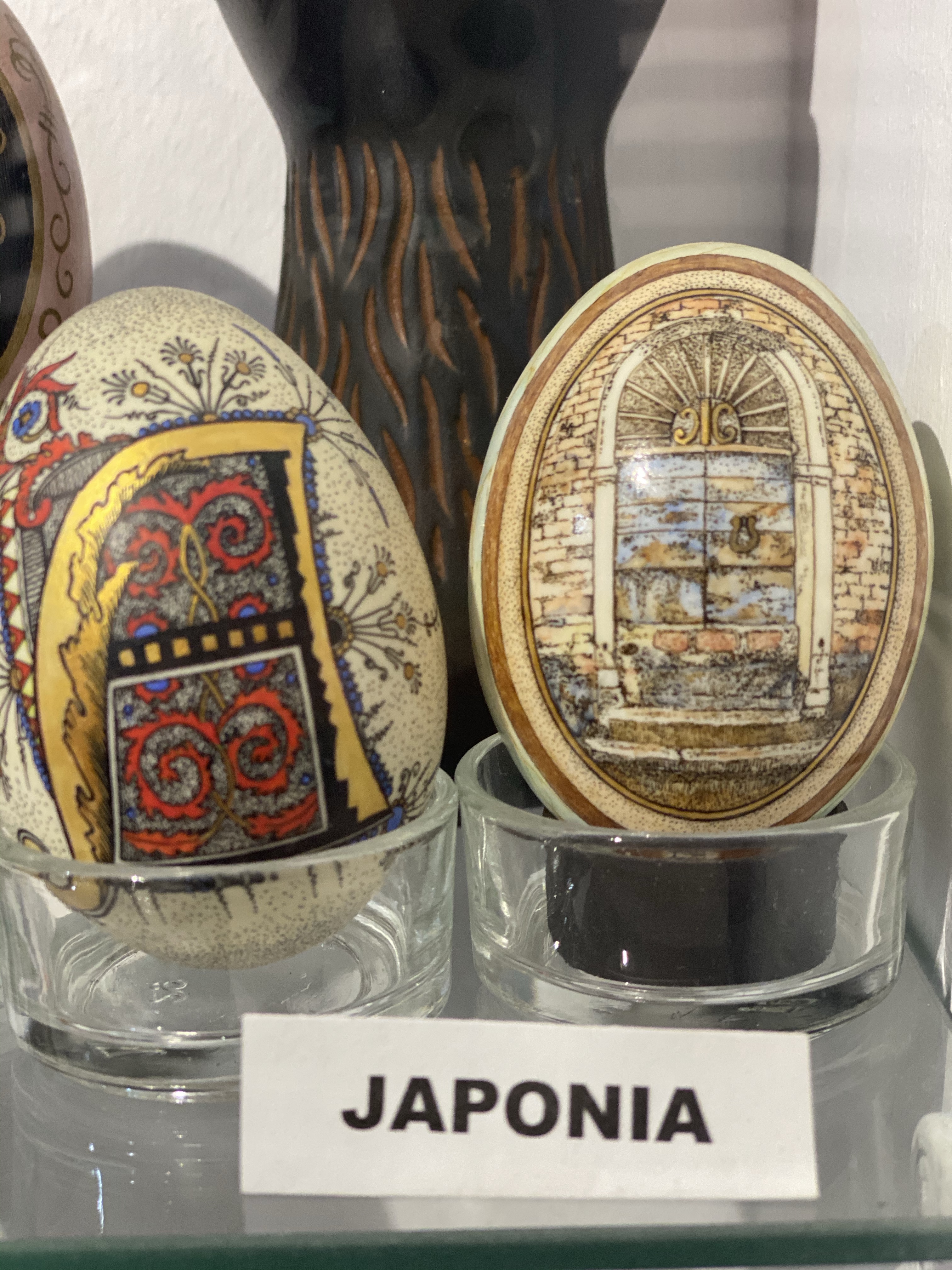 美術館1階、入り口付近にはショーケースとイースターエッグの染色方法を紹介するビデオ、次の部屋にはショーケースと子供たちが体験できるテーブルがあり、その奥にもショーケースと、一階だけでもかなり見応えがあります。さらに2階には、ルチアさんの作品に加え、ルチアさんが世界中の競技会や展覧会に参加する中で、他の国の方と交換した世界各国のイースターエッグの展示、地元のアーティストの作品を紹介するコーナーなどもあり、その違いを見るのもお楽しみポイントと言えるでしょう。世界各国から集まった卵のショーケースには日本人の方の作品もありました。おそらく、日本にはイースターエッグという習慣はないと思いますので、何かのきっかけで卵の染色を始めた方々だとは思いますが、どの作品にも日本的な柄やデザインが施され他の国々の卵に負けず劣らず、しっかりと存在感を示していました。