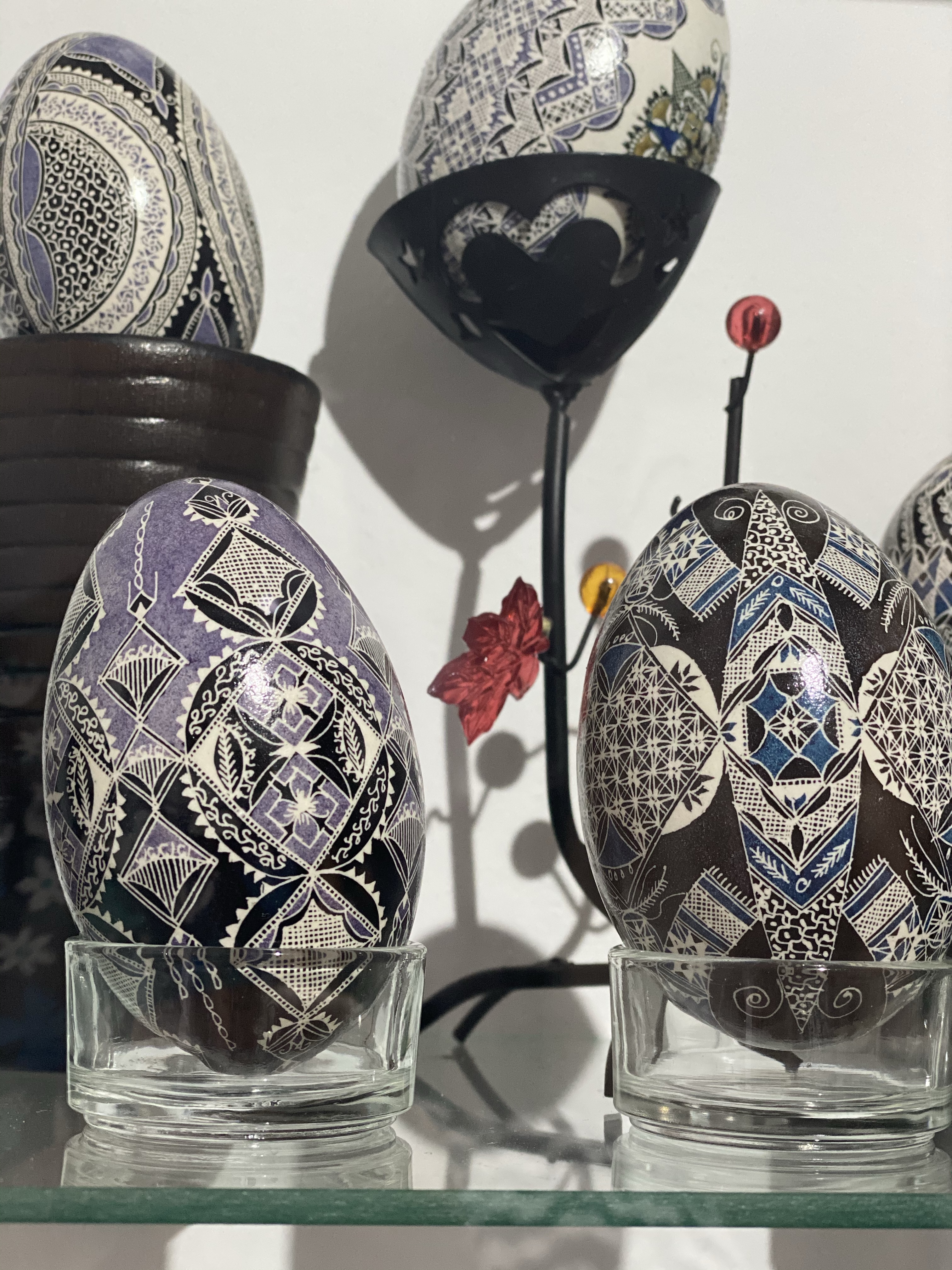 このイースターエッグの装飾には、木の棒の先に針が括られた専用の道具が用いられます。その針の先に溶かしたロウをつけて、卵にロウで柄を描き、ロウが乾いたら染色液に浸して染色し、その作業を数度繰り返すことで、カラフルな卵が完成するのです。最後にロウを全て拭き取り、繊細で鮮やかに染色された卵が誕生します。日本のろうけつ染めや、インドネシアのバティック染などと同じ技法ですね。ルチアさんの染色する卵は、頑丈であるという観点からアヒルの卵が多いそうですが、そのほかにも白鳥のものやウズラ、大きいものだとダチョウの卵を用いたものもありました。その全てが本当に美しく繊細で、まさに芸術品。一見プリントしたように正確に見えますが、よく見るとハンドペイントならではの細かな揺らぎを見ることができるのもクラフト感が増して、より芸術度を高めているように思います。