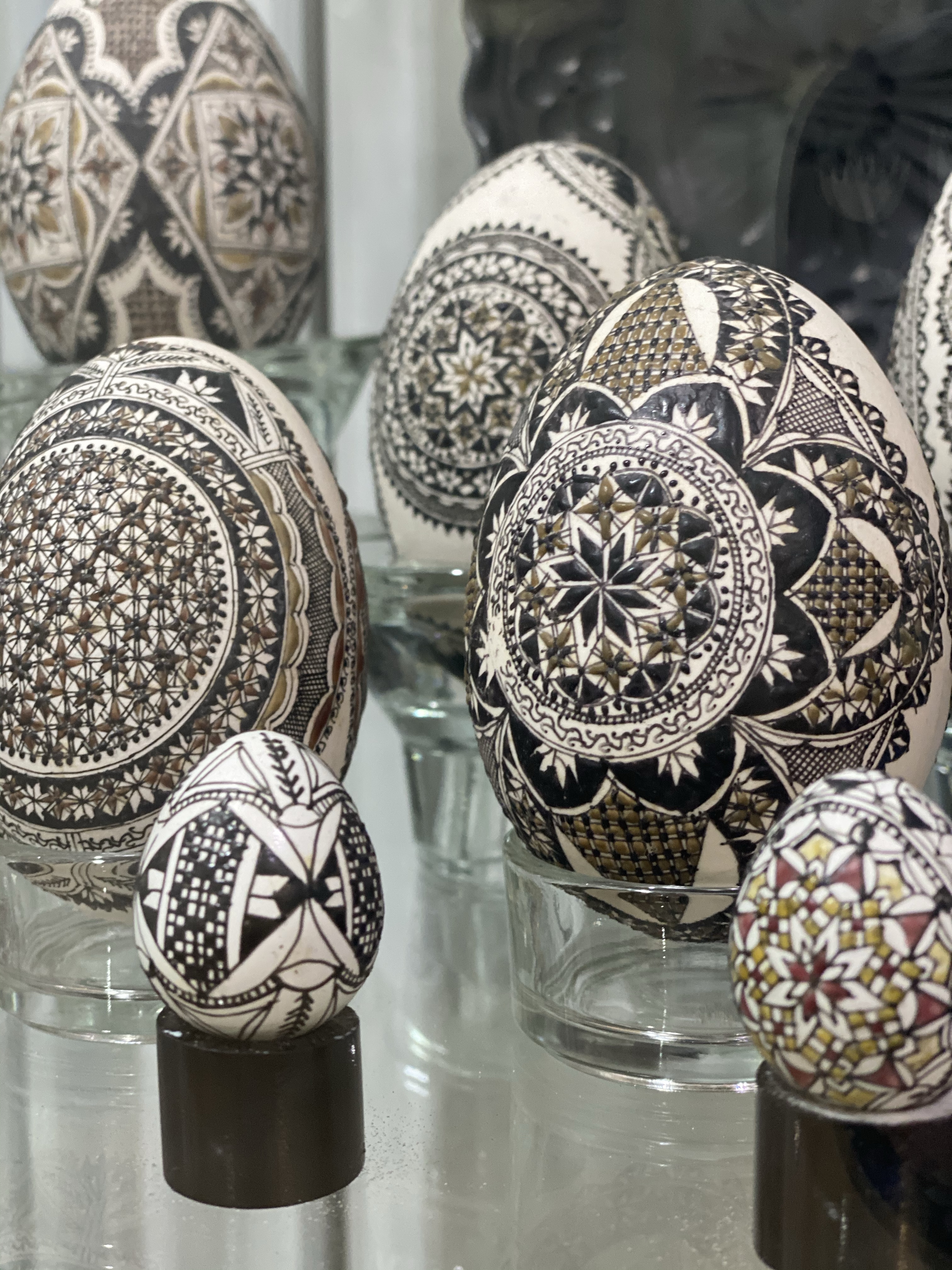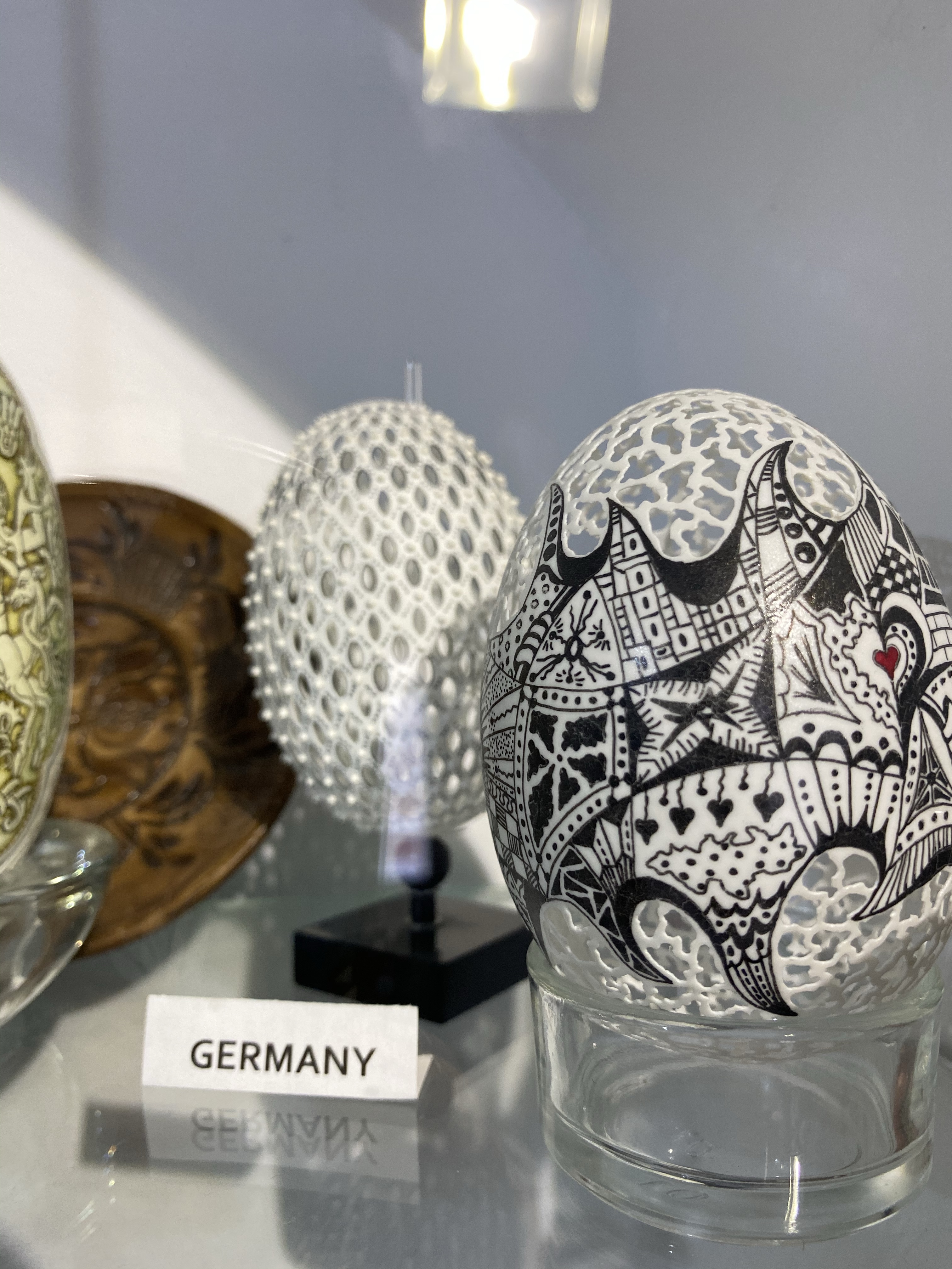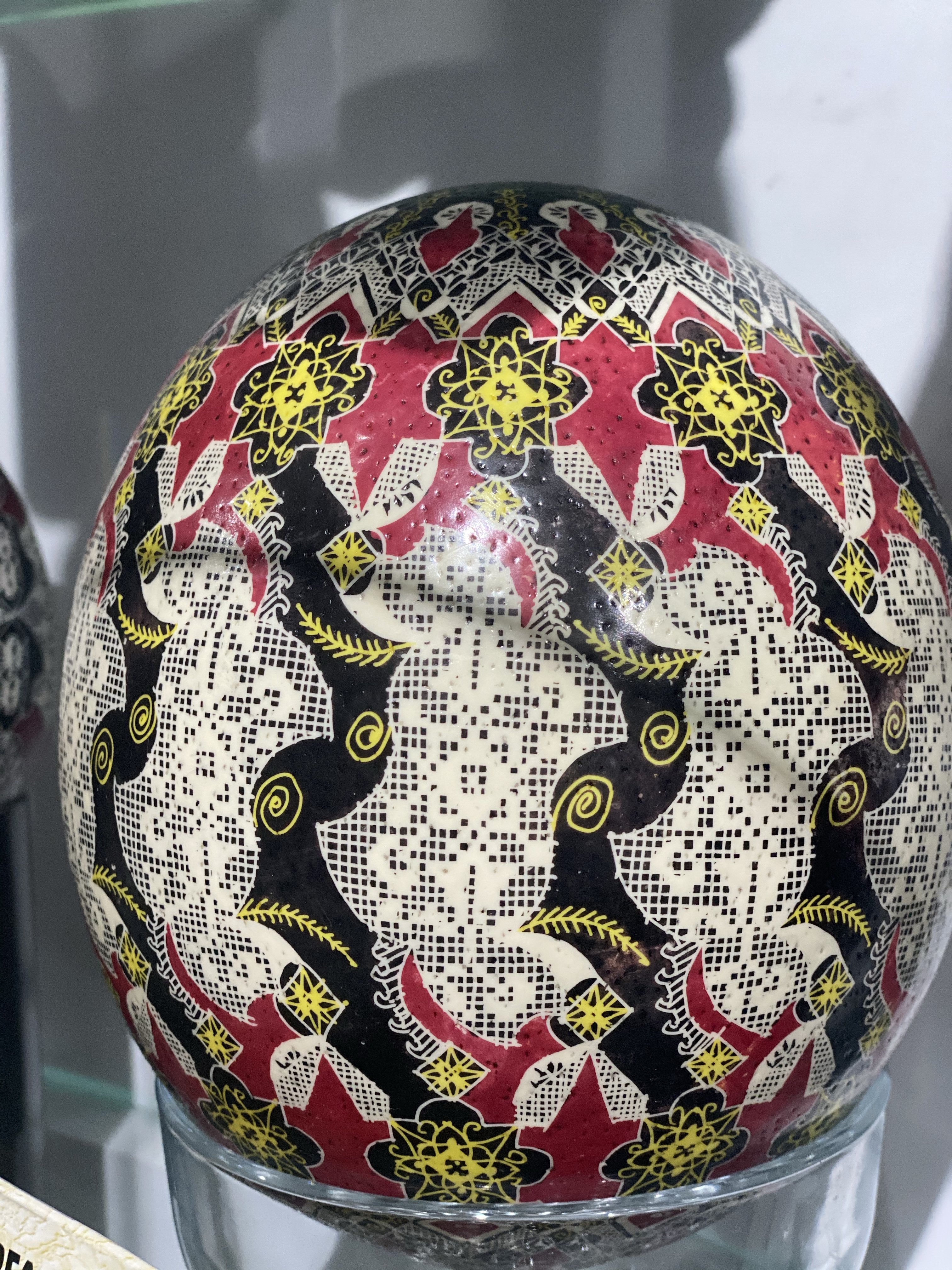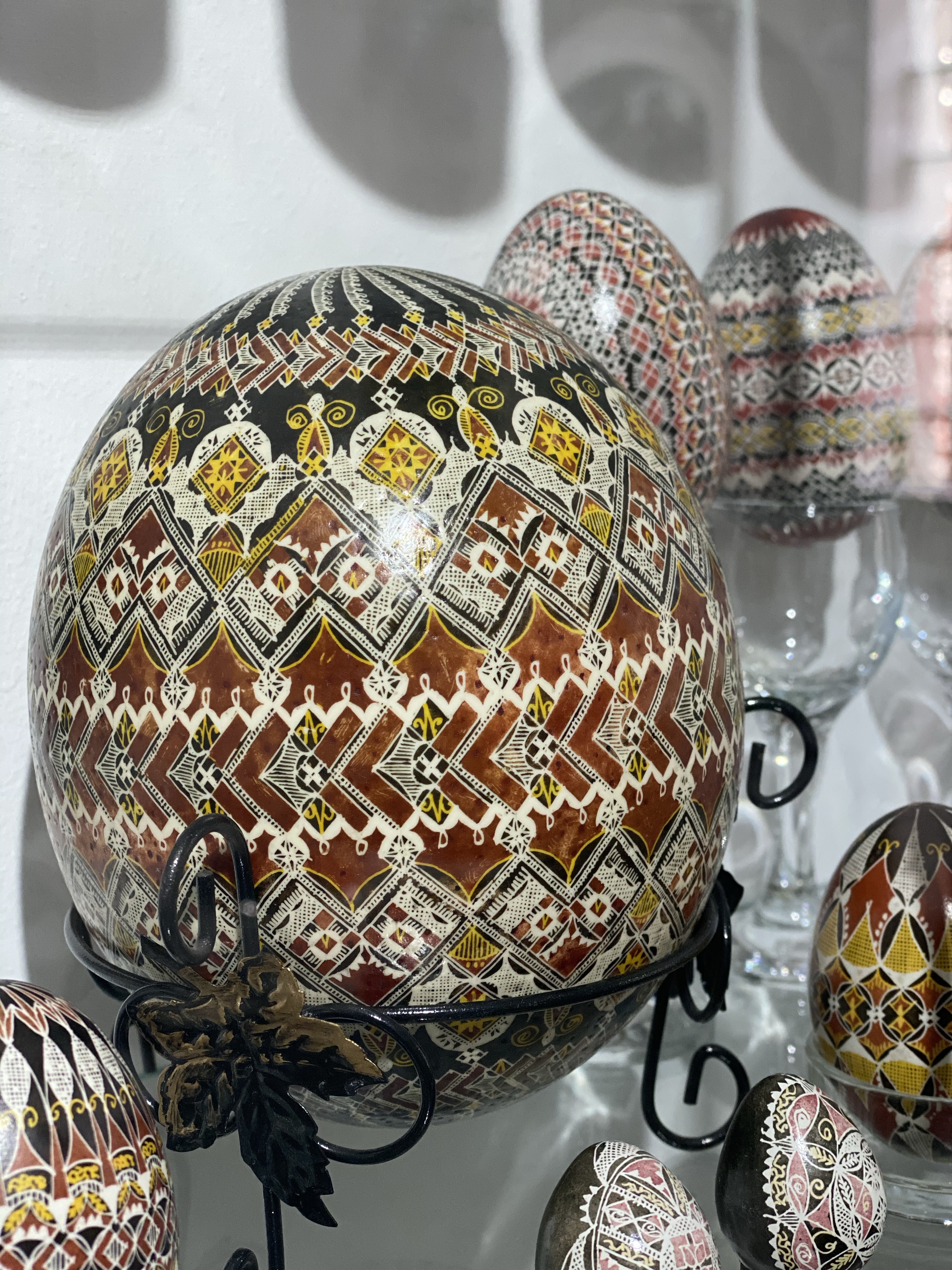 出口付近ではルチアさんの作品を購入できる売店もあります。しかし、ルチアさんの作品は一度作れば、予約で全てが売れてしまうほど人気があるそうで、数はあまり残っていませんでした。私は、伝統的なモチーフと、赤・黄色・黒・白のカラーリングが施された卵を一つ購入することができました。大きさや柄によっても価格は変わりますが、およそ50€〜100€くらい。教会などで売っているものは、1つ2€程度なので、ルチアさんの作品価値がいかに高いかが分かります。しかし、その繊細さ、そして正確さを実際に目で見ると、全く高いと感じさせない魅力に溢れているのです。単なるイースターエッグの飾りではなく、一つの芸術として我が家の家宝にしたいと思っています。