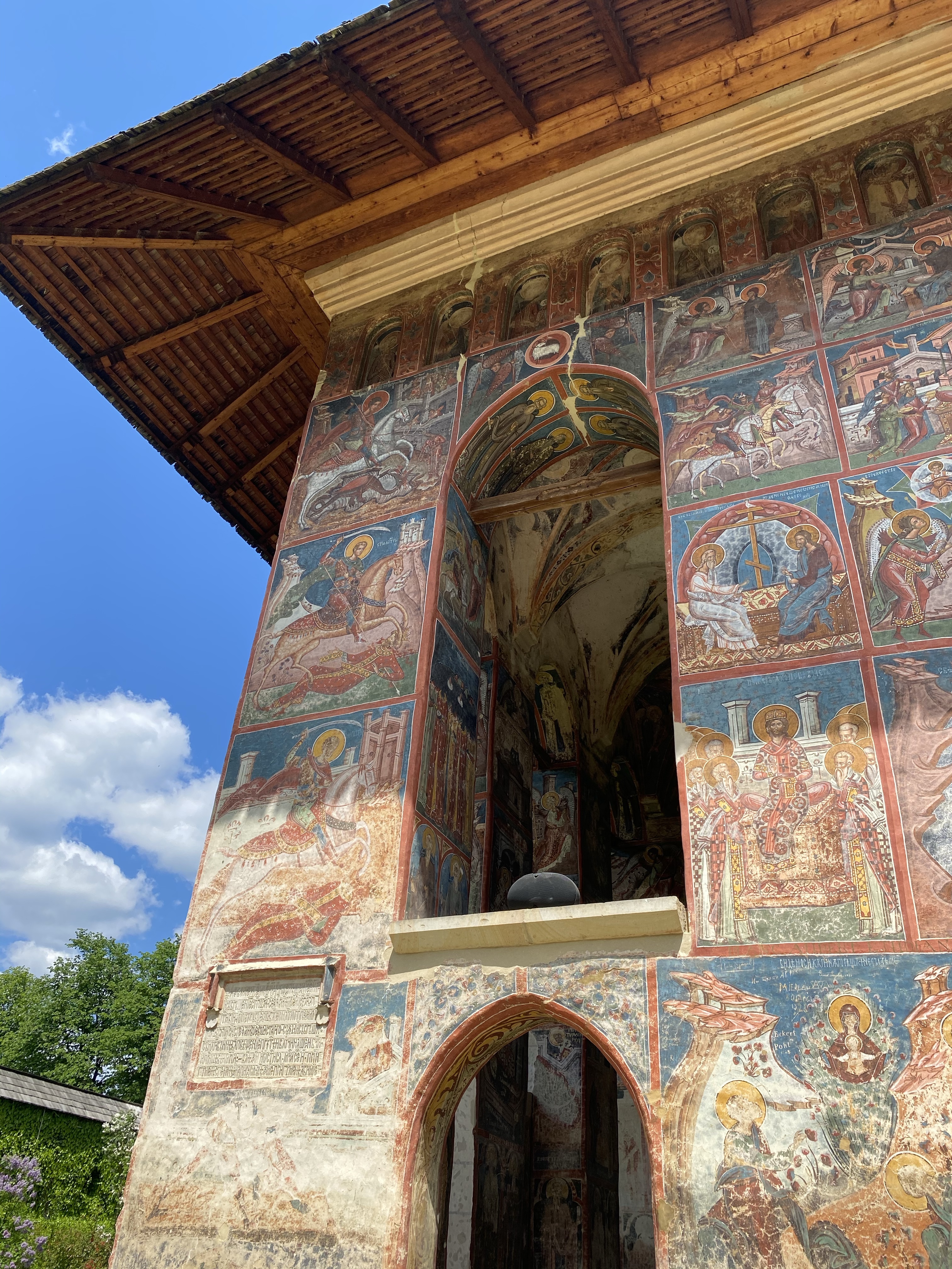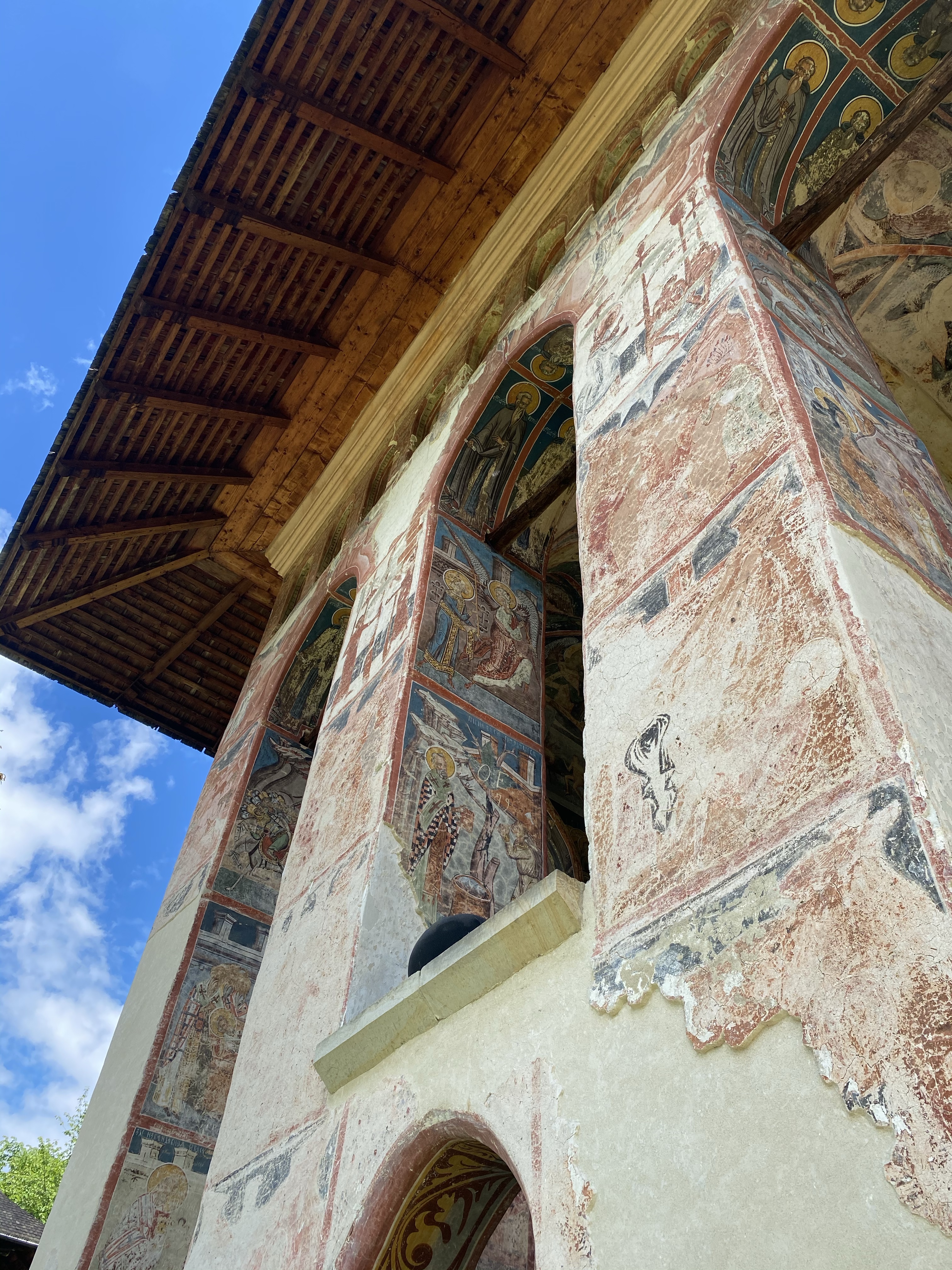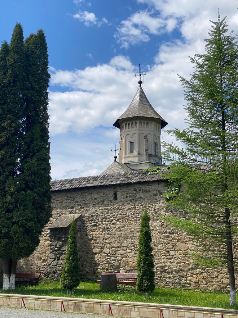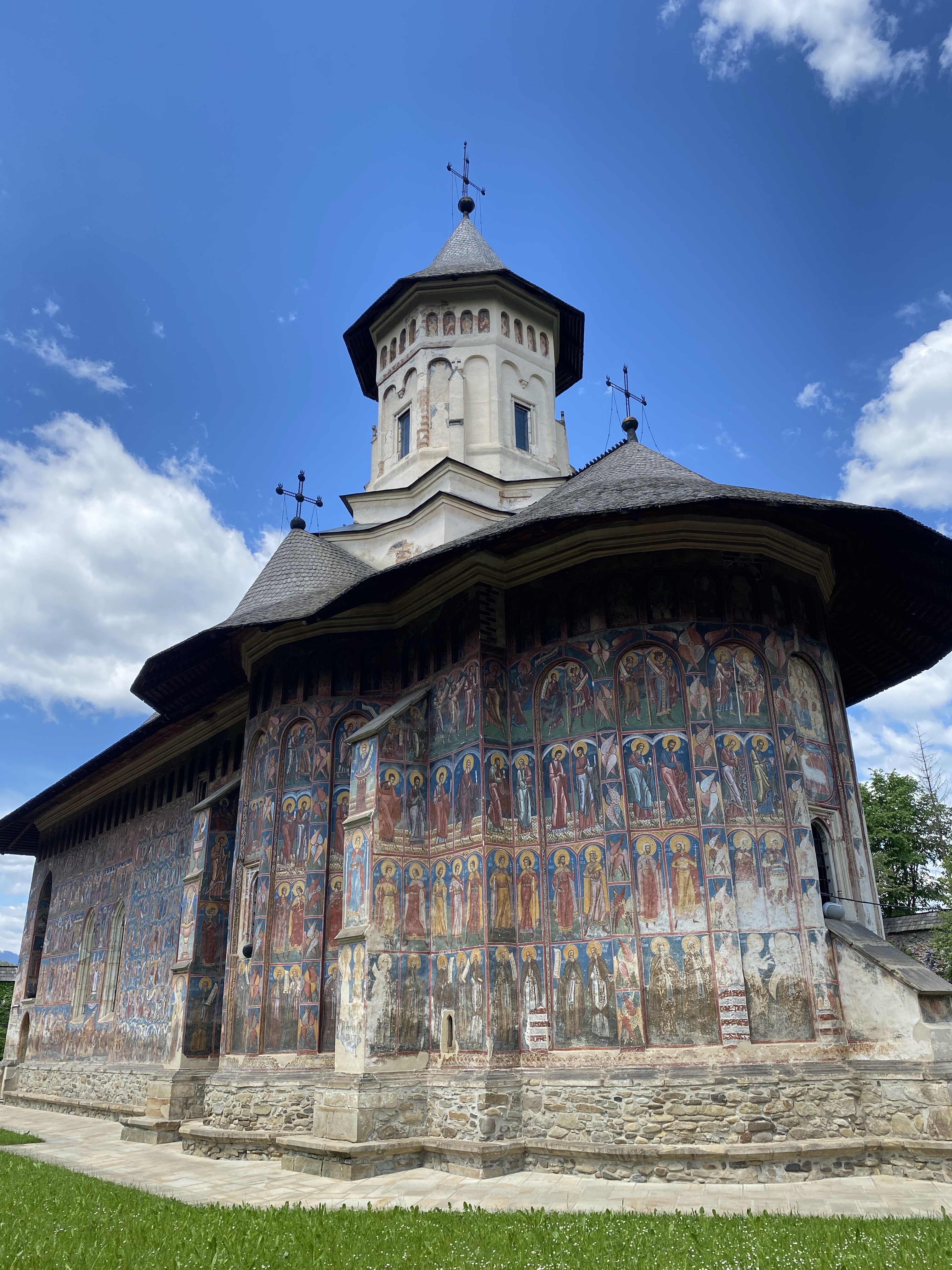 次に訪れたのは、ミュージアムの近くに位置するMoldvita Monastery (モルドヴィツァ修道院)です。モルドヴィツァ修道院は、ルーマニアでもっとも古い修道院の一つで詳しい起源は判明していません。最初の石造の教会は、1402年〜1410年の間に建設されたそうですが、地滑りのため崩落してしまいました。現在の姿は、1532年にシュテファン大公の子どもの一人によって再建されたもので、ブコヴィナ修道院同様、高い壁と防御用の塔を持つ、一見要塞のような様相を呈しています。モルドヴィツァ修道院は、街、そして文化の中心地として発展し、シュテファン大公からも商業的特権など、数々の特権を享受していたそうです。教会堂の内外壁ともにブコヴィナ修道院と同じく、美しいフレスコ画が保存されており、世界遺産の一つに登録されています。長い歴史の中で、修道院が廃止されたこともありますが、時を経て復活。1945年から15年の歳月をかけて修復され、現在の姿を留めているのです。