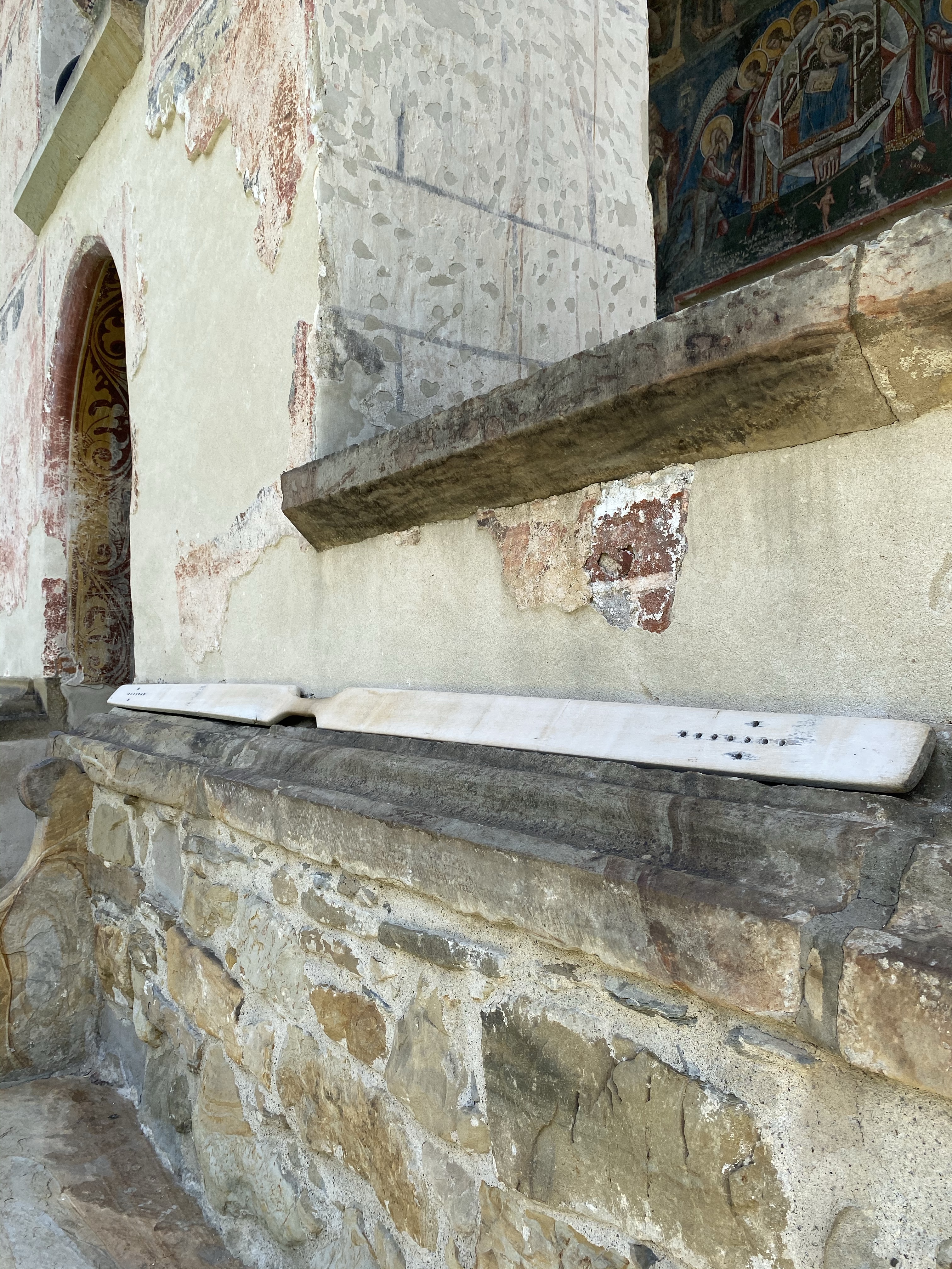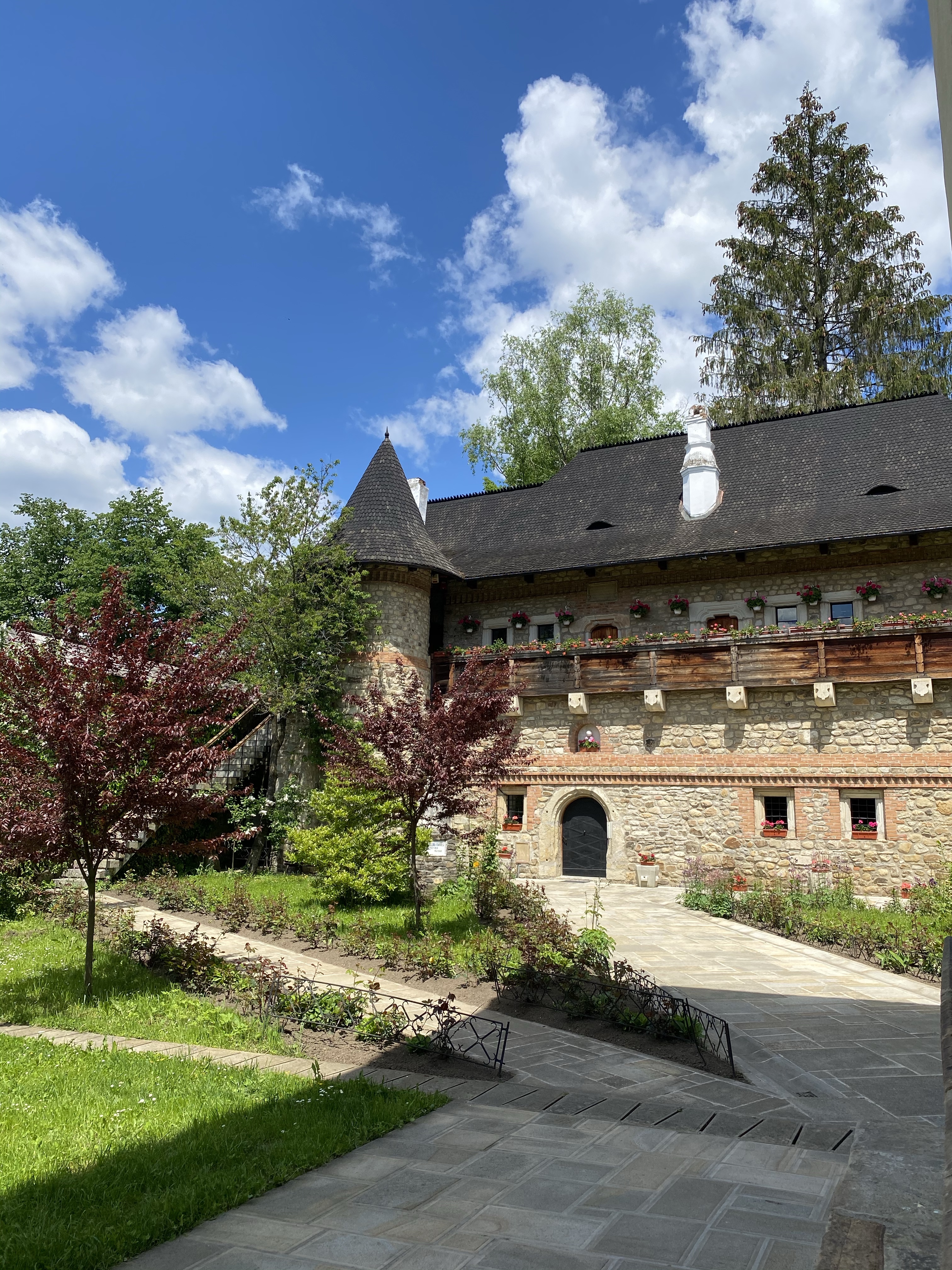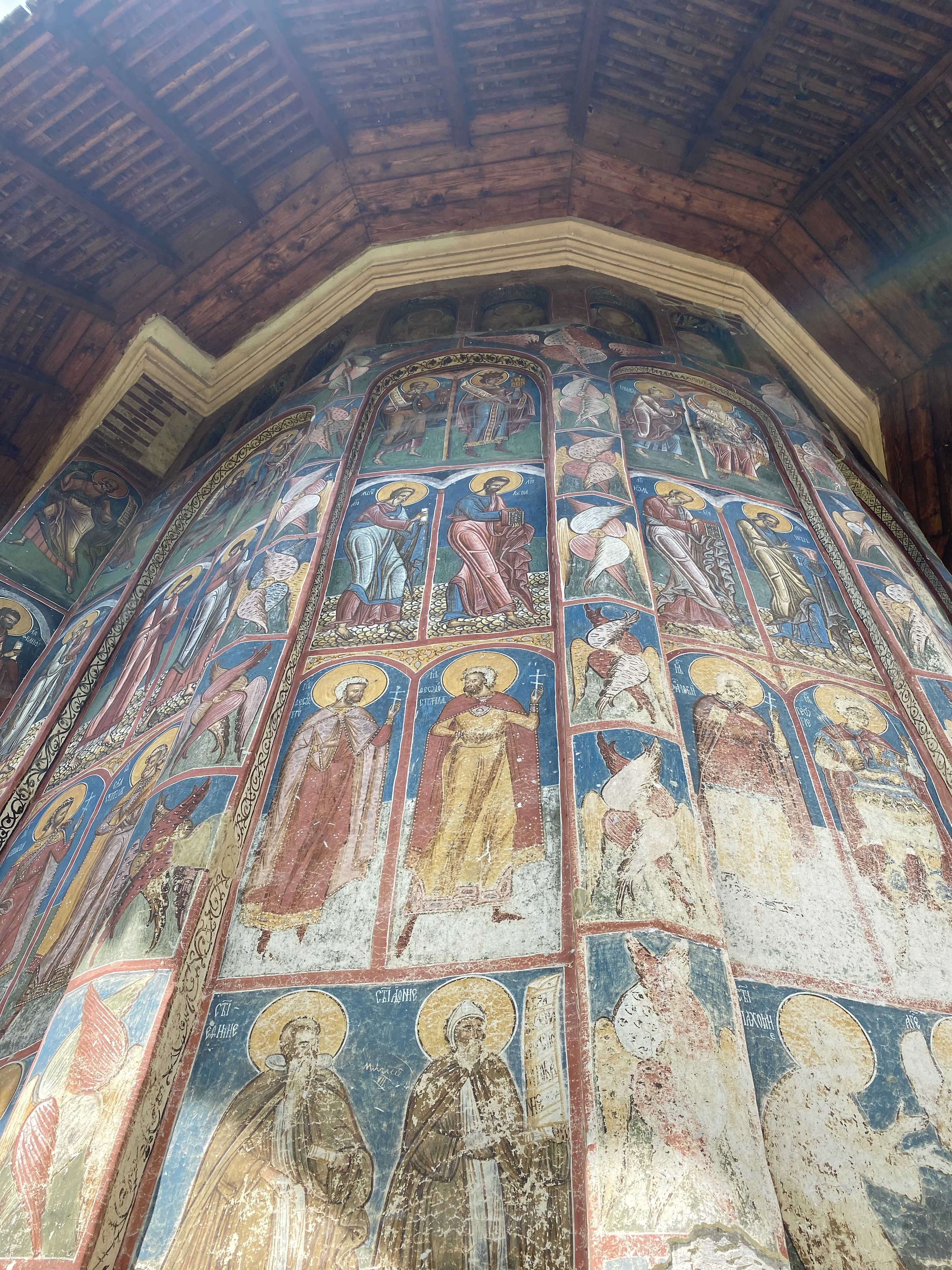 次に訪れたのは、ミュージアムの近くに位置するMoldvita Monastery (モルドヴィツァ修道院)です。モルドヴィツァ修道院は、ルーマニアでもっとも古い修道院の一つで詳しい起源は判明していません。最初の石造の教会は、1402年〜1410年の間に建設されたそうですが、地滑りのため崩落してしまいました。現在の姿は、1532年にシュテファン大公の子どもの一人によって再建されたもので、ブコヴィナ修道院同様、高い壁と防御用の塔を持つ、一見要塞のような様相を呈しています。モルドヴィツァ修道院は、街、そして文化の中心地として発展し、シュテファン大公からも商業的特権など、数々の特権を享受していたそうです。教会堂の内外壁ともにブコヴィナ修道院と同じく、美しいフレスコ画が保存されており、世界遺産の一つに登録されています。長い歴史の中で、修道院が廃止されたこともありますが、時を経て復活。1945年から15年の歳月をかけて修復され、現在の姿を留めているのです。