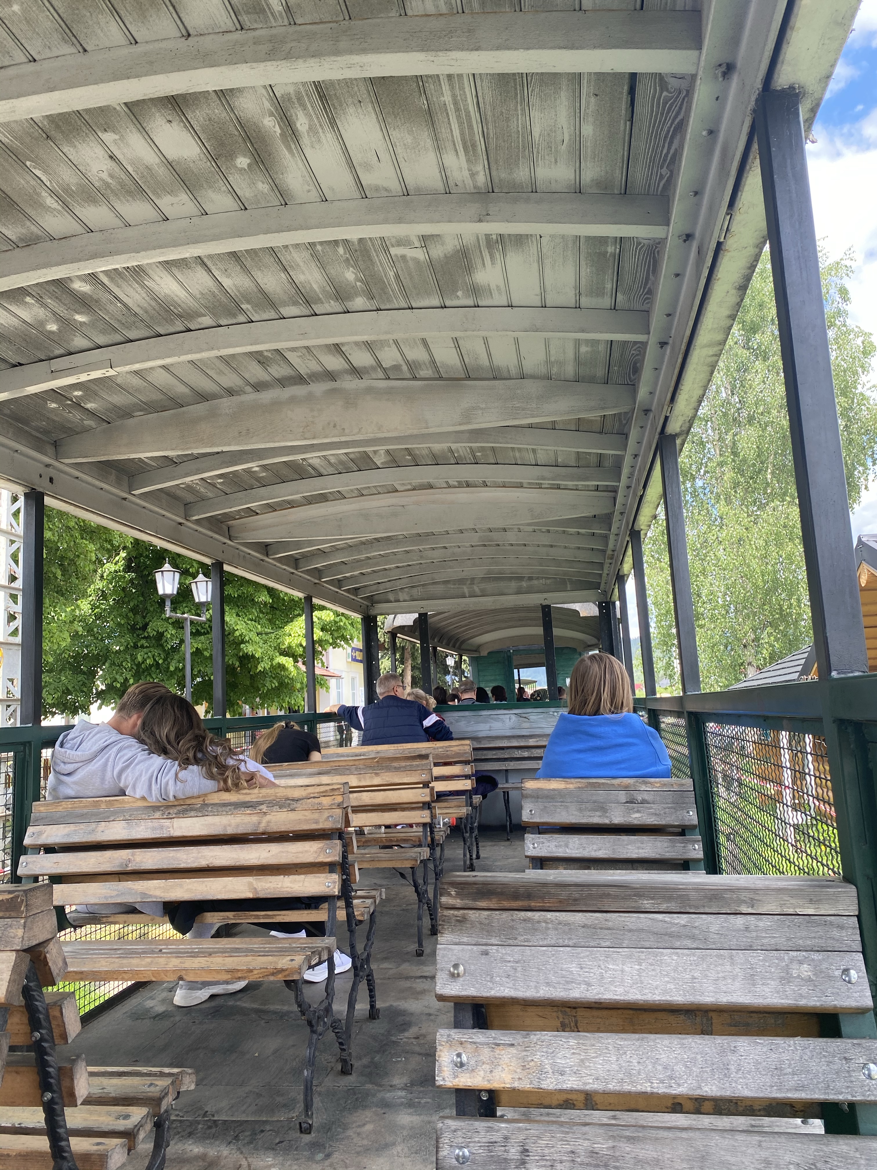 モカニツァの出発駅ではまずチケットを購入します。出発時間の30分前からしか販売は開始されないのですが、私たちが駅に着いた時にはもう列に並んでいる人たちがいました。この観光列車は、民家のそばを通りながら村を抜け、片道約1時間。山間でしばし休憩後、また同じコースをたどって出発駅まで戻ってくると言う、3時間ほどのアクティビティです。しばらく列にいると、遠くから汽笛の音がしてモクモクと黒煙を上げながら1便のモカニツァが戻ってきました。観光列車ではありますが、座席は通常の列車の形態ではなく、屋根はあるものの窓などはないため、開放感抜群です。他の観光地があまり混み合っていなかったため、モカニツァも空いているかなと思っていましたが、出発時間ギリギリまでたくさんの乗車希望者が乗り込み、10両ほどの列車はみるみるうちに満席に近い状態に。私たちは早めにチケットを購入できたこともあり、最後尾を確保。当日は天気に恵まれ、清々しい風を感じながら乗車を楽しむことができました。