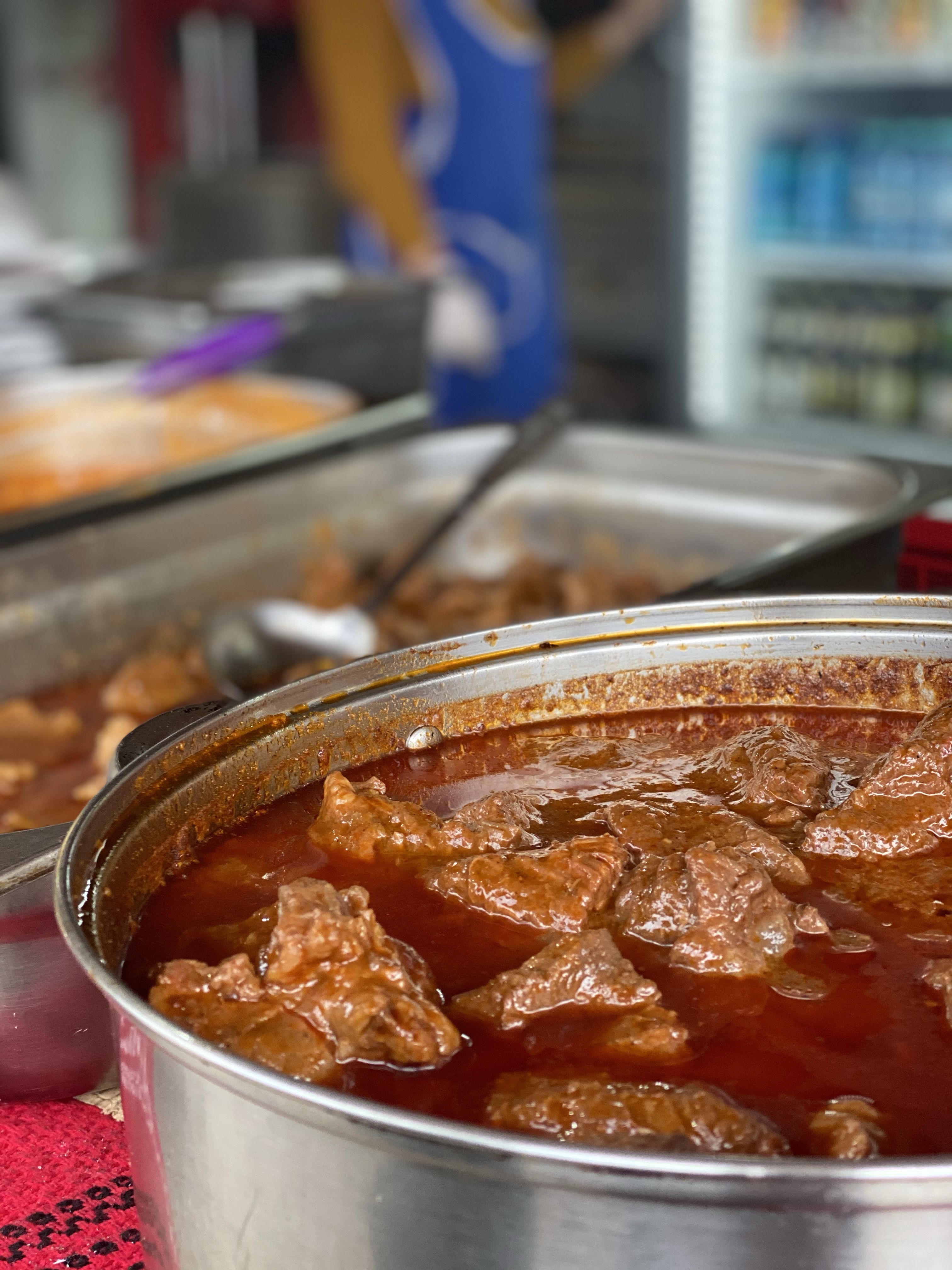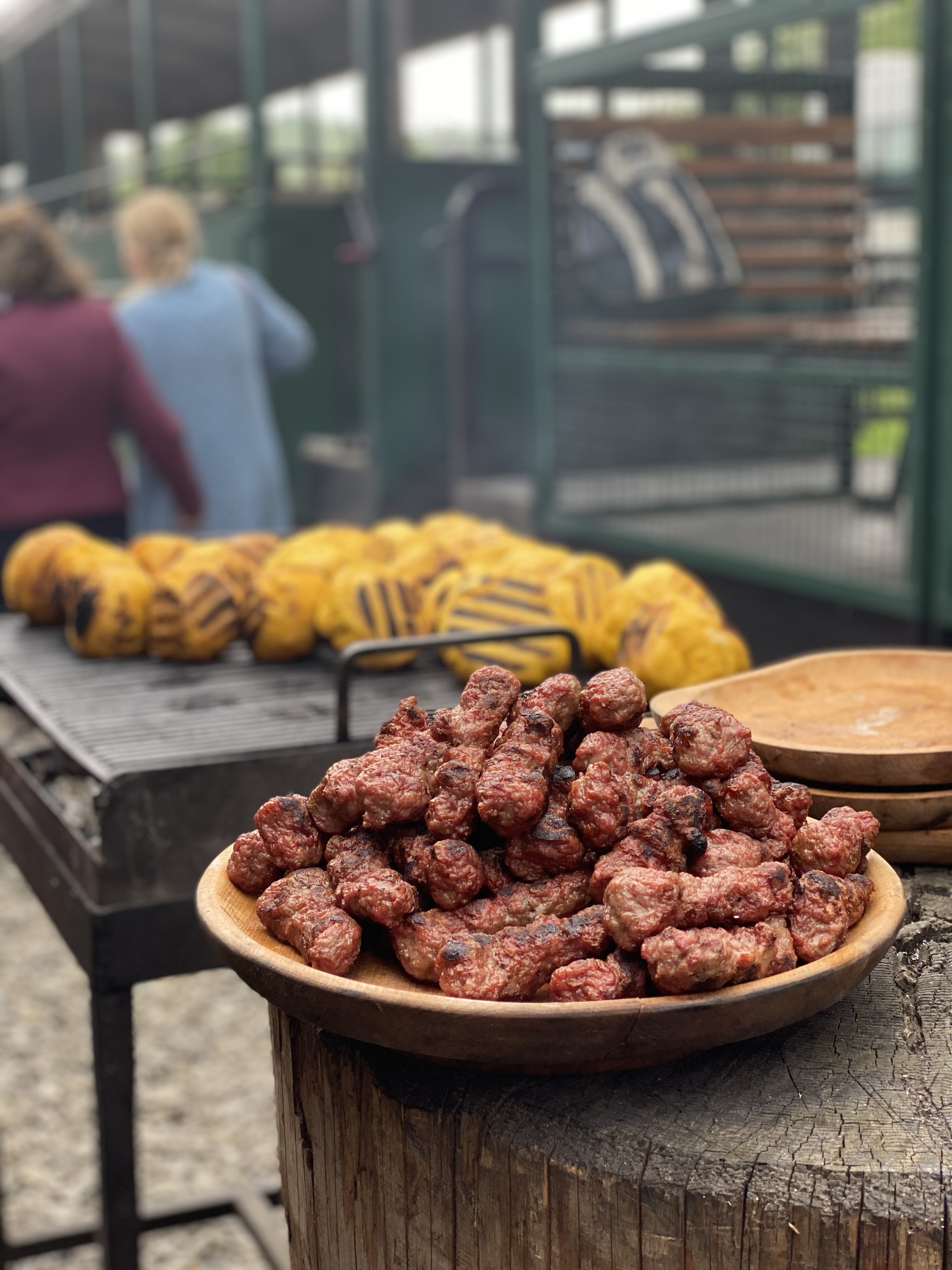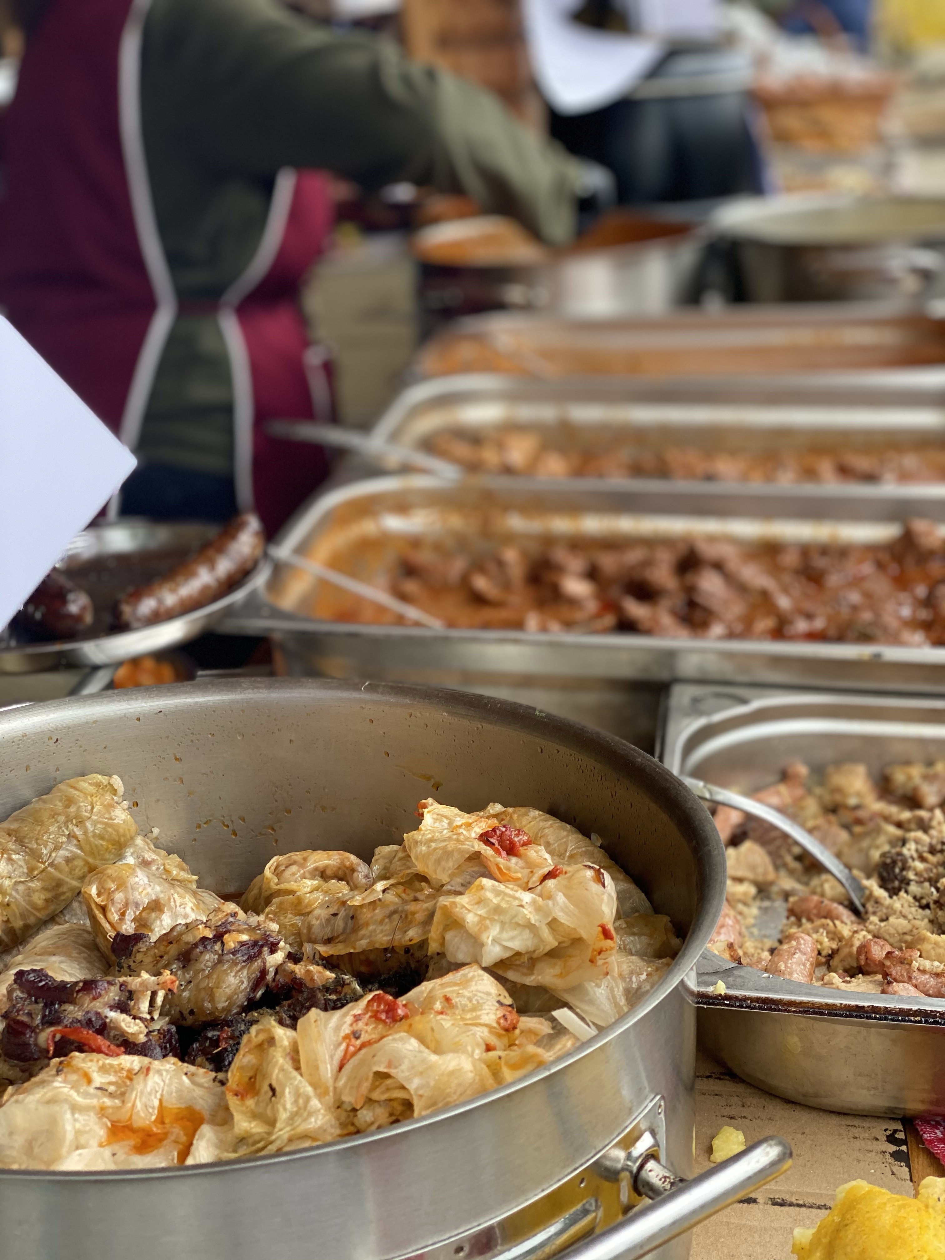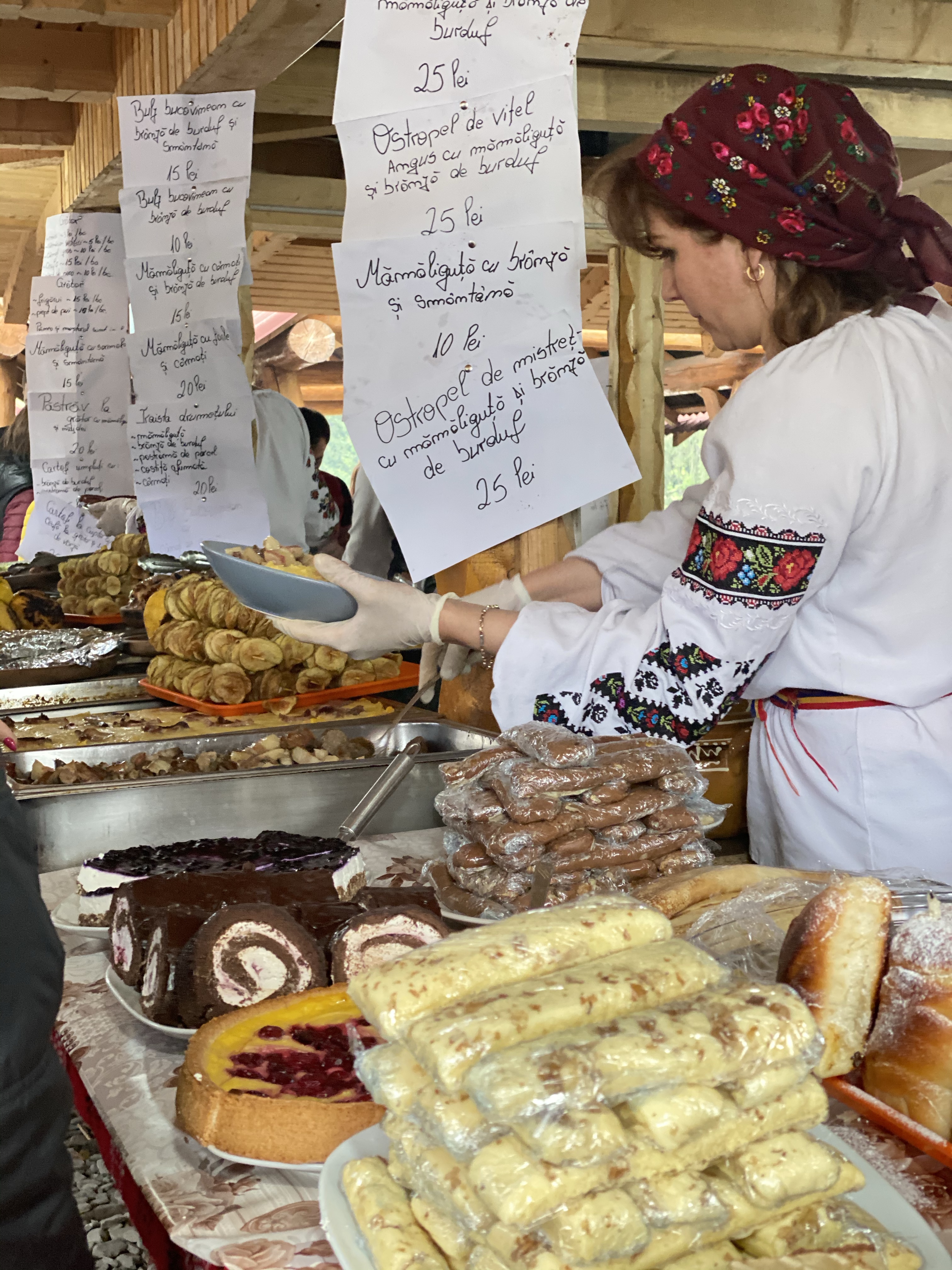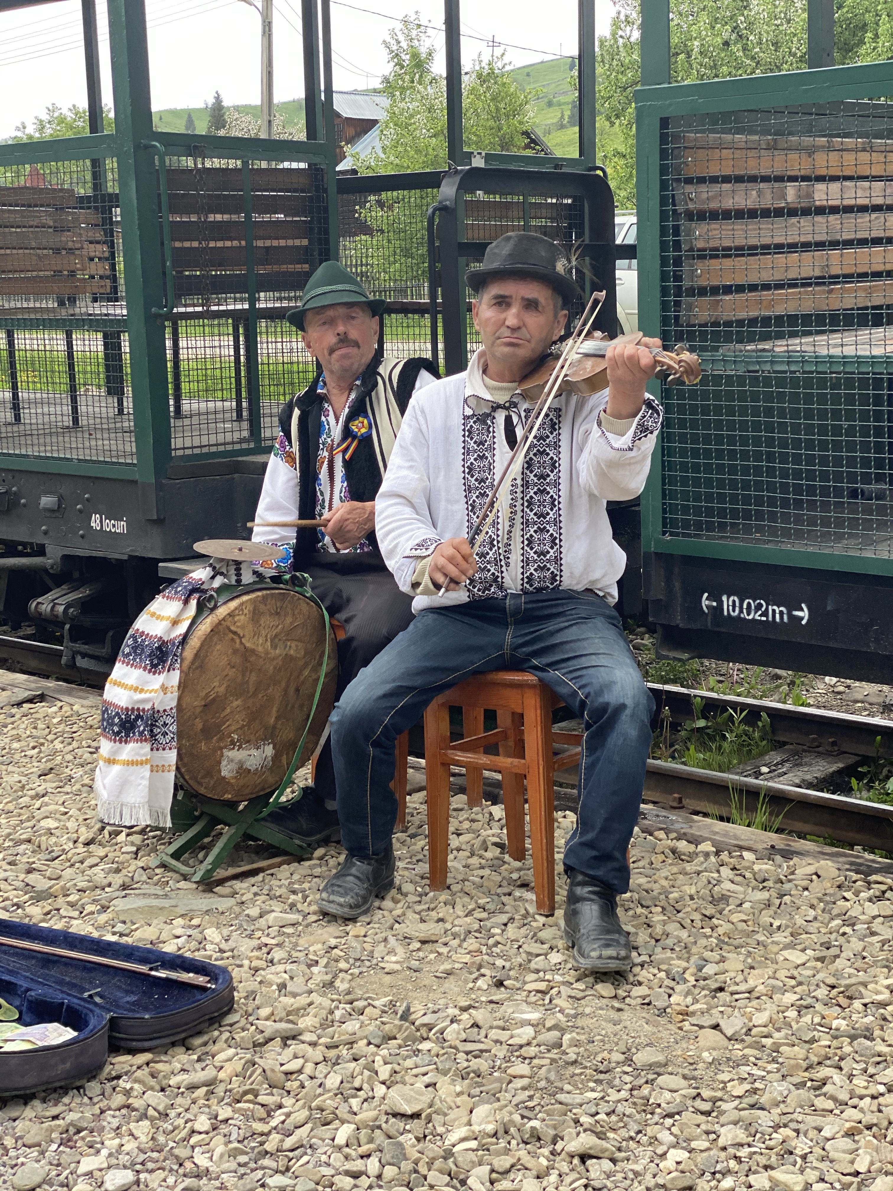 民家スレスレを通る際には、実際の人々の暮らしを垣間見、列車に向かって手を振ってくれる村人もいます。また、民家の奥にはなだらかな丘、そして急な斜面が広がり、放牧された牛や羊が草を食む様子が伺えます。新緑の季節と合間って、あたりはほぼ緑一色。のんびりとした山間の暮らし、自然を眺めながら、ゆっくりと列車は進んでいきました。途中、あわや事故にと言うくらい車との距離が近い場所もあるので、それはそれでルーマニアらしさを感じることもできました。1時間ほど進むと、折り返し地点に到着。折り返し地点では、ルーマニアの民族衣装に身を包んだスタッフが、伝統料理を提供する屋台が軒を連ねていました。炭火焼きの香ばしい匂いがあたりに立ち込め、お昼を食べていなかったこともあり急激に空腹を感じます。中央では、2人の男性が楽器を奏で、周りのテーブルでは人々が思い思いに食事を楽しみ、小さなお祭りのような賑わいを見せていました。