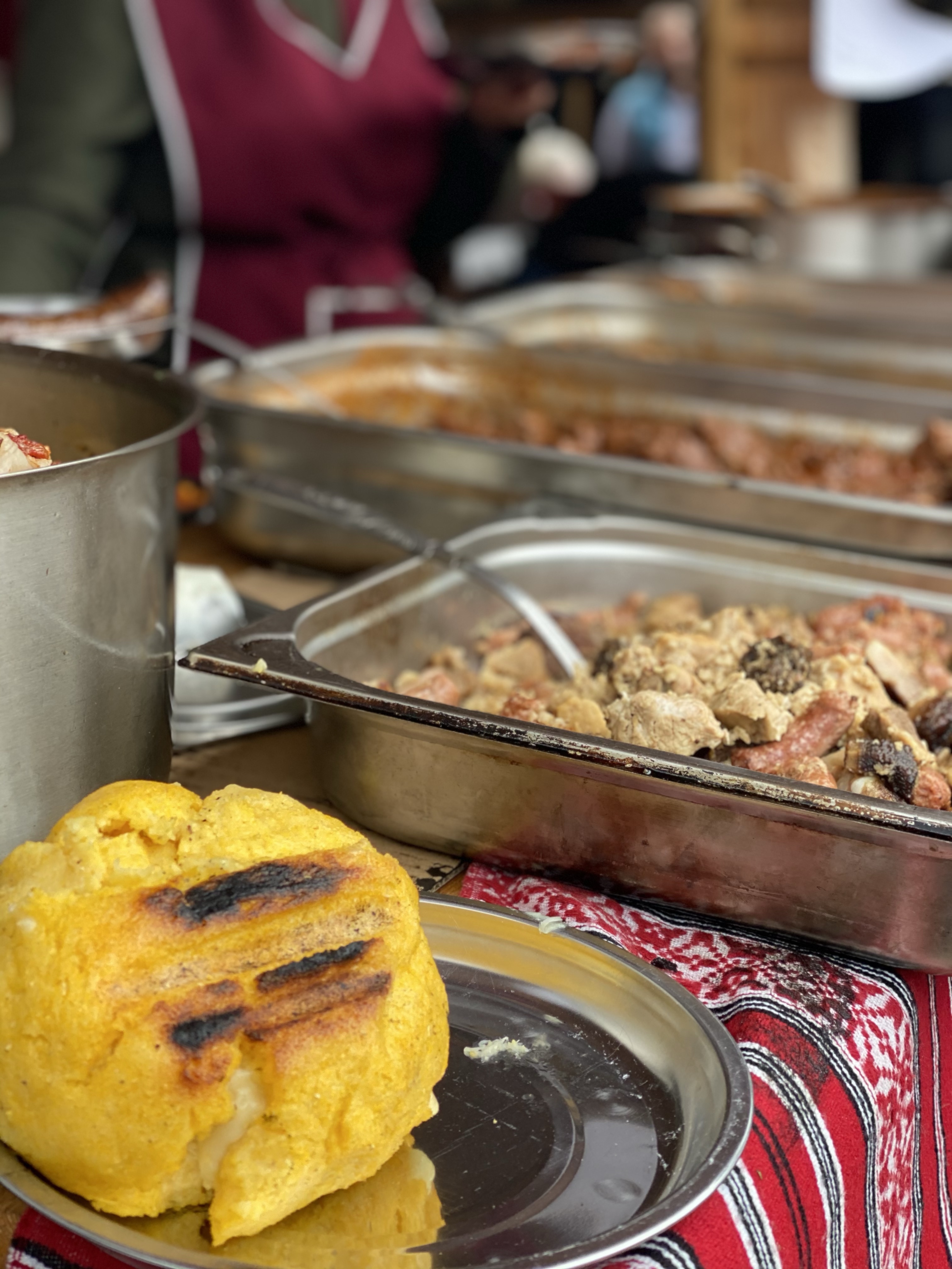 スープや豆料理、サルマーレなど、魅力的な逸品にひかれながらも、私たちが選んだのはミティティと呼ばれるソーセージとハンバーグの合いの子のような肉料理と、チーズを中に入れて丸く成形したママリガを炭火で焼いたブルズと言うもの。時間が限られていたので、チャチャっと食べてお土産屋さんをのぞいていると、あっという間に出発時間になりました。この折り返し地点の休憩は40分ほどでしょうか。もう少し時間があれば、周囲の散策などもできましたが、諦めてまた電車に乗り込みます。来た道をまたゆっくりと帰るだけですが、景色も少し違ってみえ、なんだかんだとても楽しかったです。その後、義兄家族と合流し、ペンションへ帰宅。