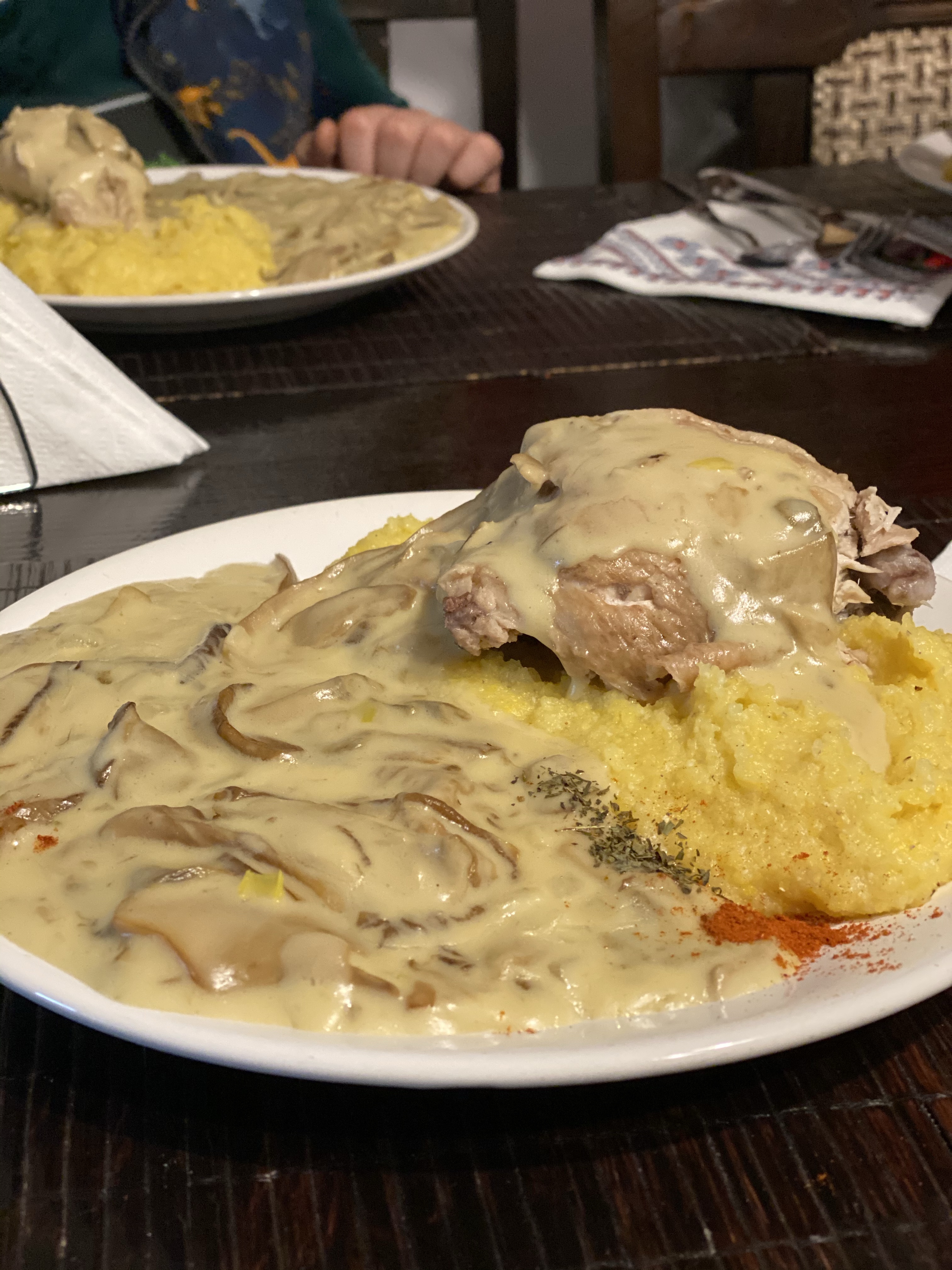 この日は、ペンションでディナーをとりました。鶏肉のキノコチーズクリームソースという料理。ホワイトソースにチーズを混ぜたソースはかなり濃厚で、グリルした鶏肉の旨みを引き立てていました。付け合わせはママリガ。ママリガたくさんいただいて、しばらくはいいやと思ってしまいました。その後、深夜まで語り合って一日を終えました。