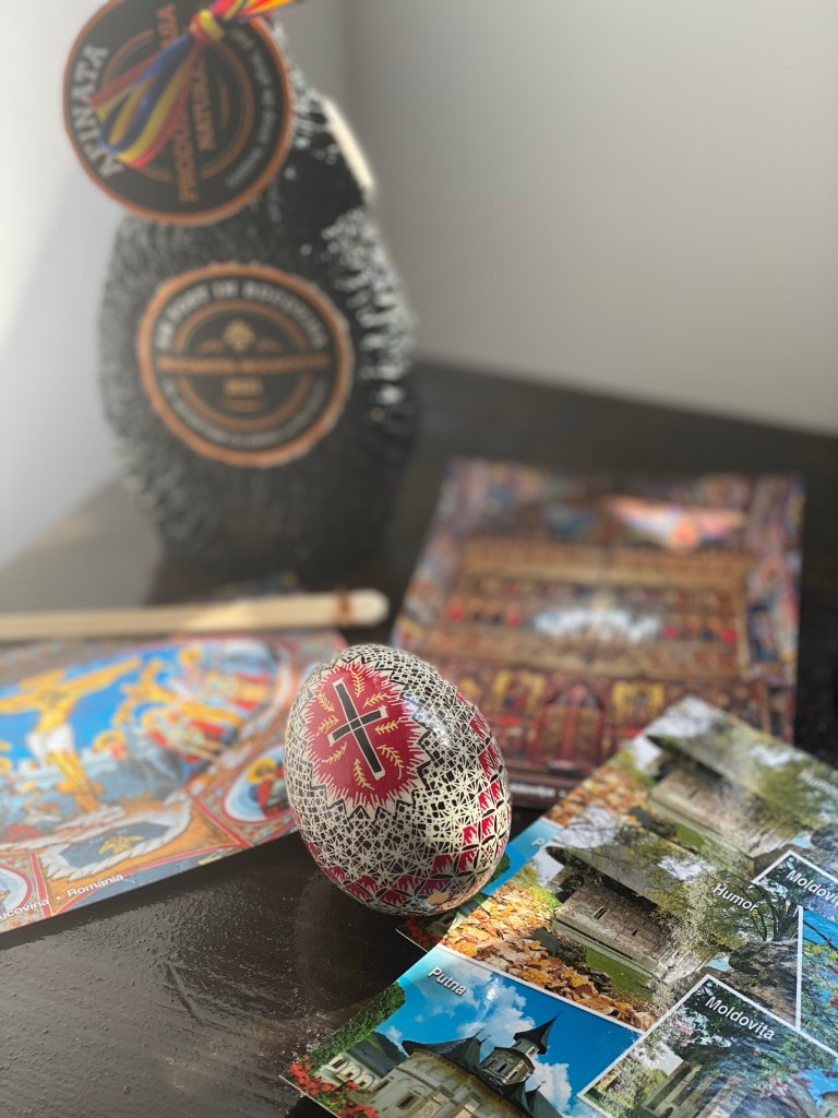 下調べをしていなかった私ですが、今回訪れたかった場所の一つに、イースターエッグのミュージアムがありました。ブコヴィナ地方は、イースターエッグの装飾、染色に関しても有名で、中でも数々の受賞歴を誇る世界的アーティストのLucia Condrea(ルチア・コンドレア)さんが営むミュージアムに行ってみたいと思っていたのです。モカニツァ乗り場のそばにあったので、まずはミュージアムに向かうことになりました。道沿いに大きな卵のモニュメントがあり、路地を進むとミュージアムにたどり着きます。ただし、ミュージアムの外観などには目立った看板はなく、一見普通のお家に見えるので注意が必要です。コロナ禍でもあったので開館しているか不安でしたが、なんと庭仕事をしていたご本人が扉を開けてくださいました(!)