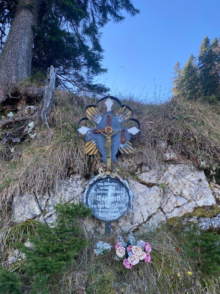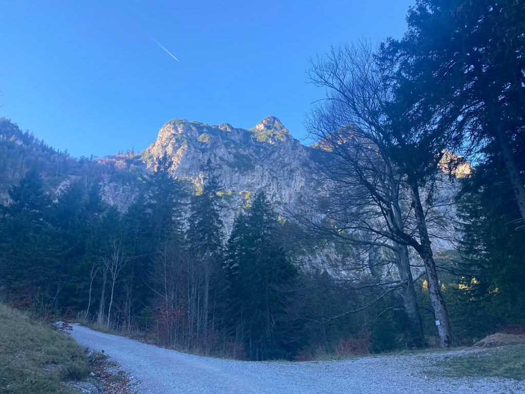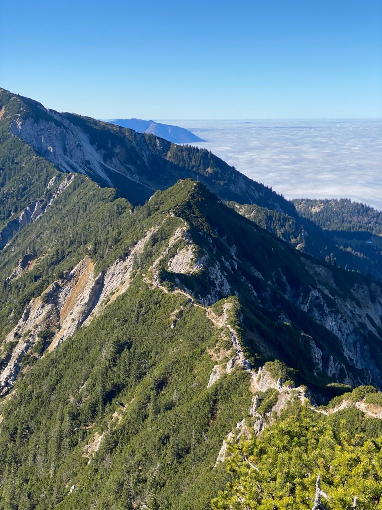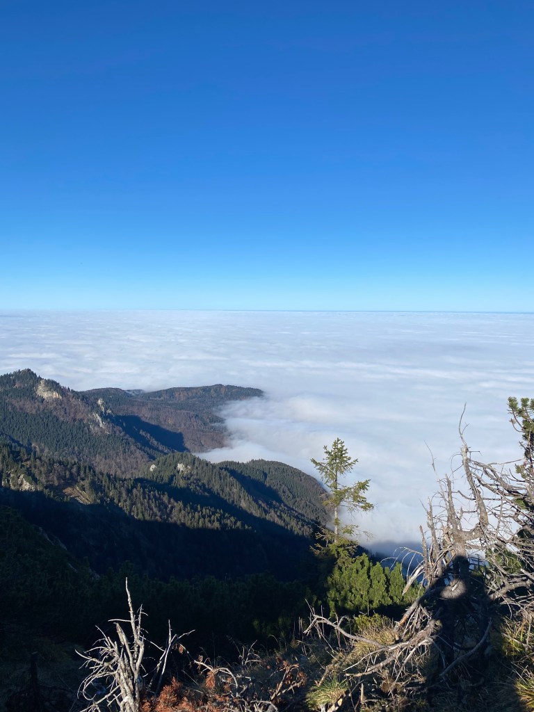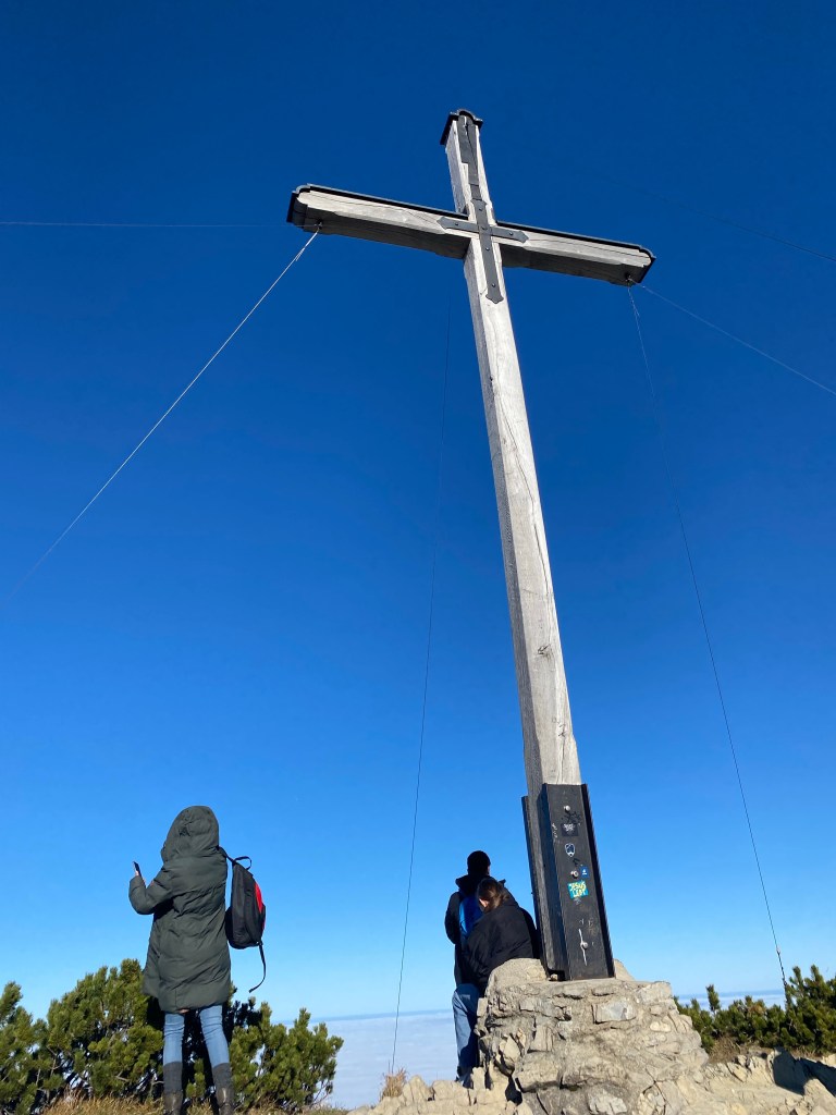 レストランまでの山道は、車も通れるくらいの幅があるのですが、その後の山頂までの道のりは、一人か二人がやっとの幅まで狭くなります。降りてくる人たちを待ったり、追い越す人を待ったりしながら登りました。そしていよいよ山頂へ。山頂には、大きな十字架と小さな小屋が立っています。山頂に立ち、周りを見渡すと工程からは考えられないほど、かなり高度まで来ていたことに驚かされました。また、ヨーロッパアルプスの一端を担う山なので、景色の美しさにも驚愕。特に、私が登った11月はドイツ側は深い霧に覆われ、オーストリア側は、晴天という自然の力を見せつけられる、不思議な光景が広がっていました。歩けるのではないかと思うほど厚い霧(雲)が麓まで広がり、峰の反対には湖とアルプス。アルプスの山々の頂上はすでに雪を纏っています。