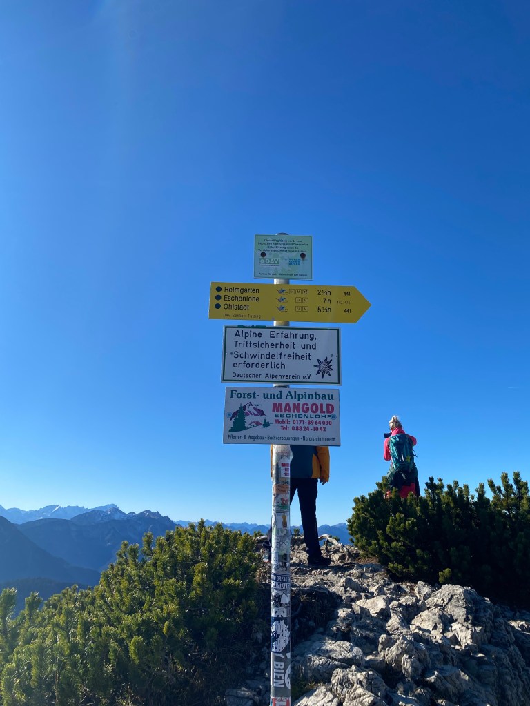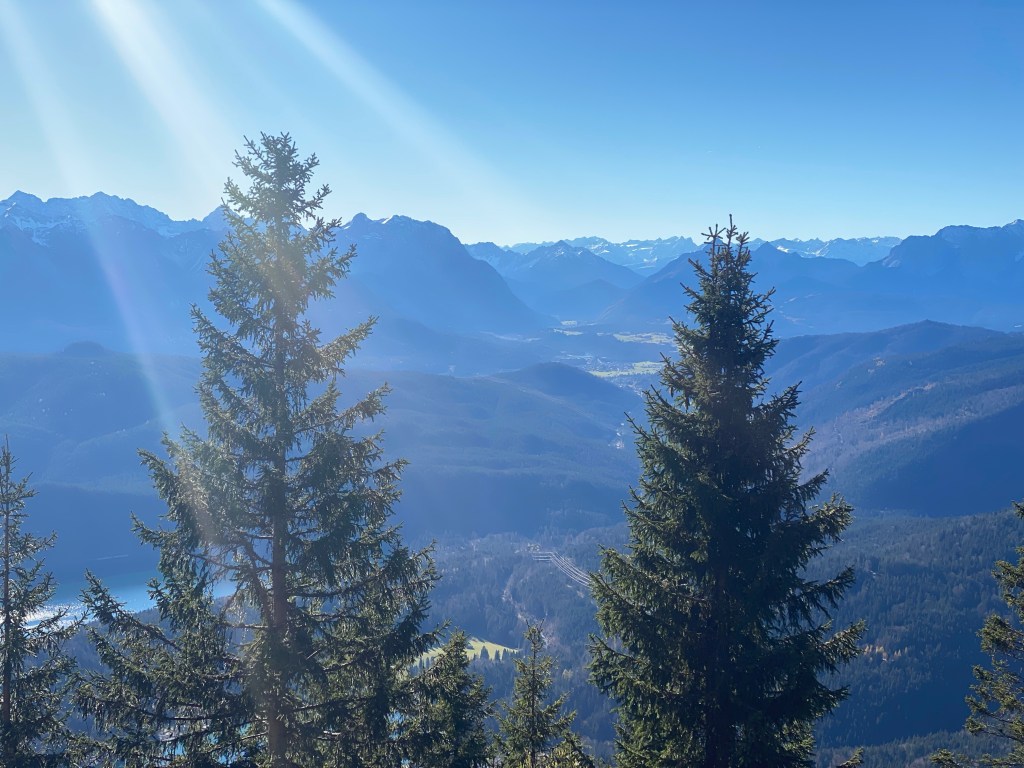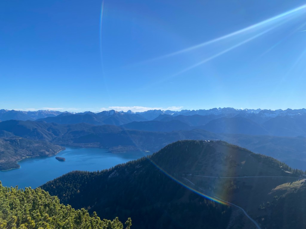 山頂付近には、ドイツ料理の山小屋レストランがあり、飲み物や軽食がいただけます。こちらのレストランまでは、登山初心者の私が友人と話しながら、しかし休みなく登って2時間かからないくらいでした。すれ違う人たち、追い越していく人たちと南ドイツ特有の挨拶「Servus」(こんにちは!)と言葉を交わしながら、ひたすら山頂を目指します。途中、開けた場所が何度かあるので、長閑な景色も楽しみながら。日本ではあまり、山登りらしい山登りをしたことがないのですが、飼い犬を連れた人、小さな子供連れ、赤ちゃんを背負って登山している方などもいて、体力がすごいなーと感心してしまいます。