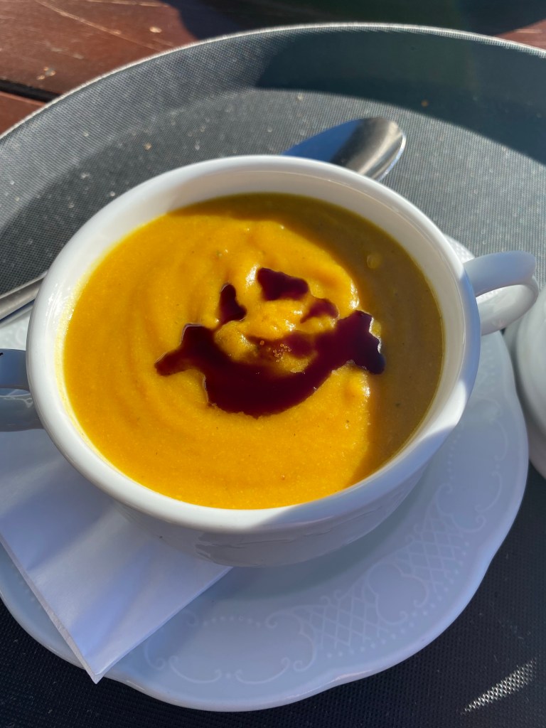 レストランでしばし休憩。早朝から行動していましたし、そんなに普段運動もしないのに、汗をかきかき登ったので、食事というより少し間食程度にしました。ヴィーガンのカボチャスープとコーヒーという謎の組み合わせでオーダー。レストランのテラス席からは、麓の湖が望め、アルプスの絶景も広がっています。30分ほど休憩し、引き続き山頂を目指します。レストランからは山頂が見えているので、心なしか気持ちも楽です。