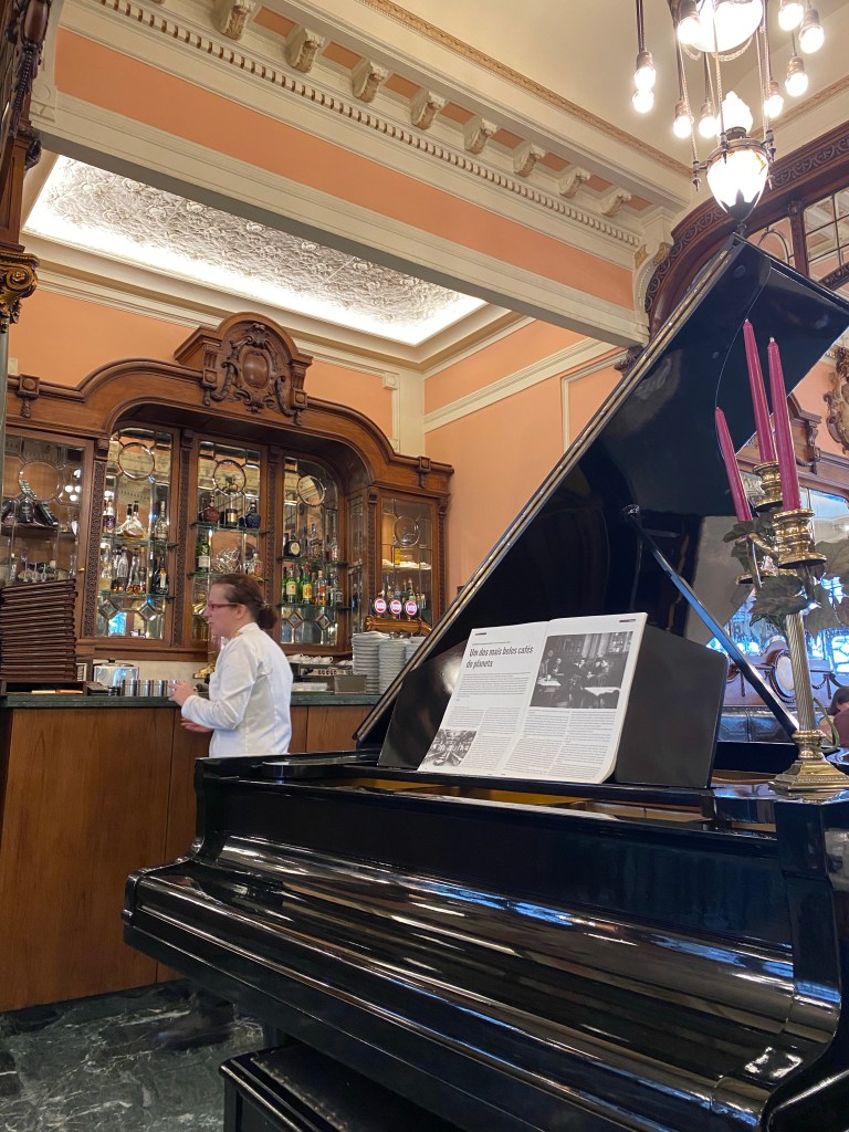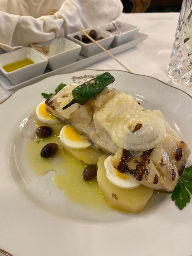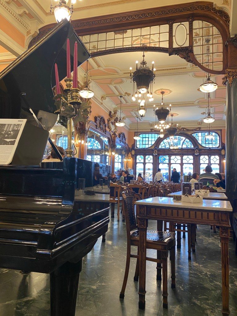 一度ホテルに戻り、購入したお土産品を部屋に置いて、遅めのランチをとることにしました。世界一に選ばれたこともある「Sao Bento」駅に立ち寄り、美しいアズレージョを眺めたら、街の中心部へと足を進めます。歩行者天国になっているショッピングストリート「サンタ・カタリーナ通り」を目指し、ポルトの老舗カフェ「Cafe Majestic」へ。1922年開業の歴史あるカフェで、政治家や学者、芸術家が集う社交場として機能していた場所だったということもあり、アールデコ調のインテリアがシックで高級感漂う空間が魅力です。ポルトガルは全体的にドイツに比べたら物価は安いのですが、このような歴史的背景もあって観光地としても人気なので、全体的にメニューは少々割高。私は、お腹が空いていたこともあり、ポルトの名物、「鱈のグリル」をいただきました。塩漬けにした乾燥鱈を戻して焼いたメニューで、たっぷりのオリーブオイル、じゃがいものロースト、ゆで卵、玉ねぎと共もにいただきます。塩漬のため、独特の匂いは感じるものの、白身は本当にふんわり、焦げ目をつけて焼き上げられた鱈は食べ応え満天。食事の後にスイーツもいただきたかったものの、食事だけで満腹になり、引き続き歩みを進めます。