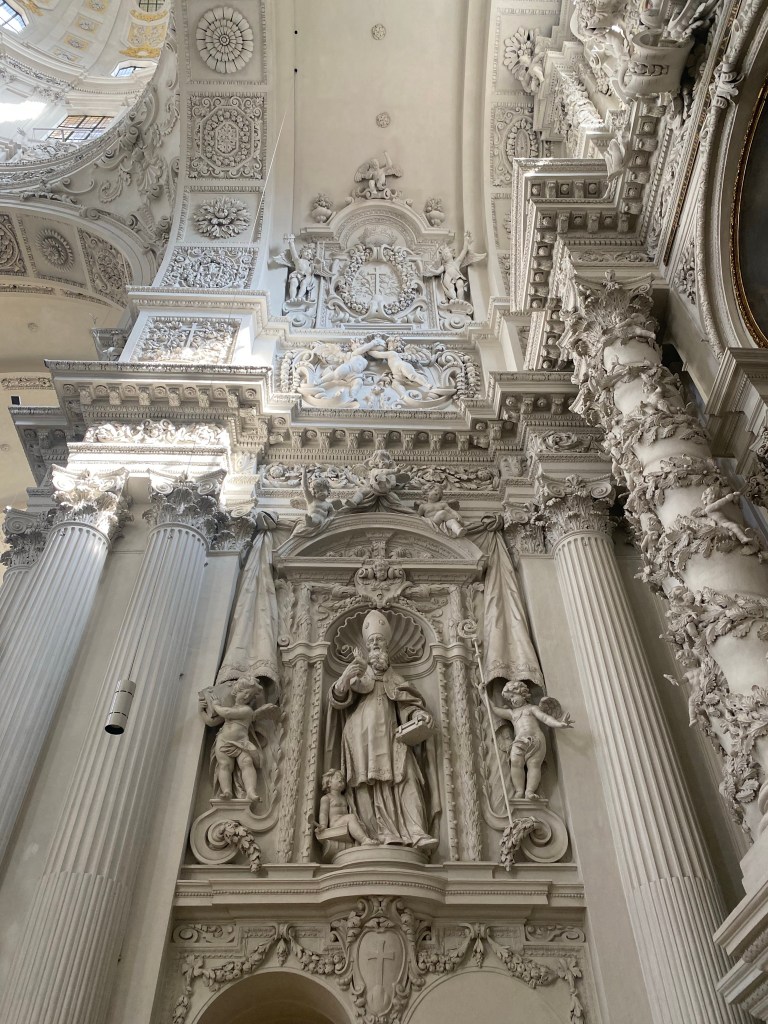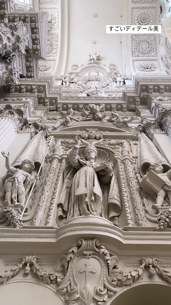 教会に入ると、内観の身廊は長さ72.50m、幅15.50m、高さ18mほどで、祭壇の手前、上部には直径18mほどのドームが設置されています。柔らかな黄色の外観とは打って変わり、内観は真っ白い漆喰と豪華な彫刻がに彩られた空間です。