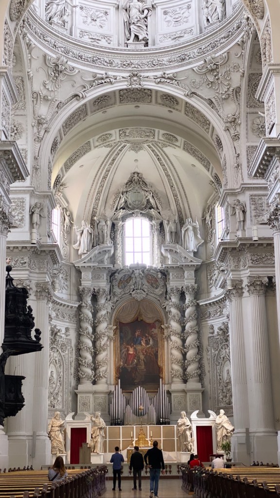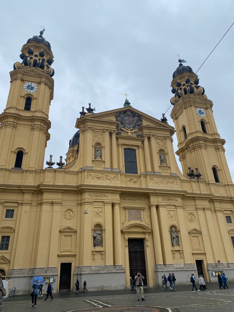 今日ご紹介する教会は、「Residenz munchen」(レジデンツ宮殿博物館)のそば、黄色い外観が目印の「Theatiner kirche」です。イタリアの旧バロック式を模して建てられたカトリック教会としては、バイエルン州初であり、モデルはローマの「サンタドレア・デッラ・ヴァッレ教会」と言われています。