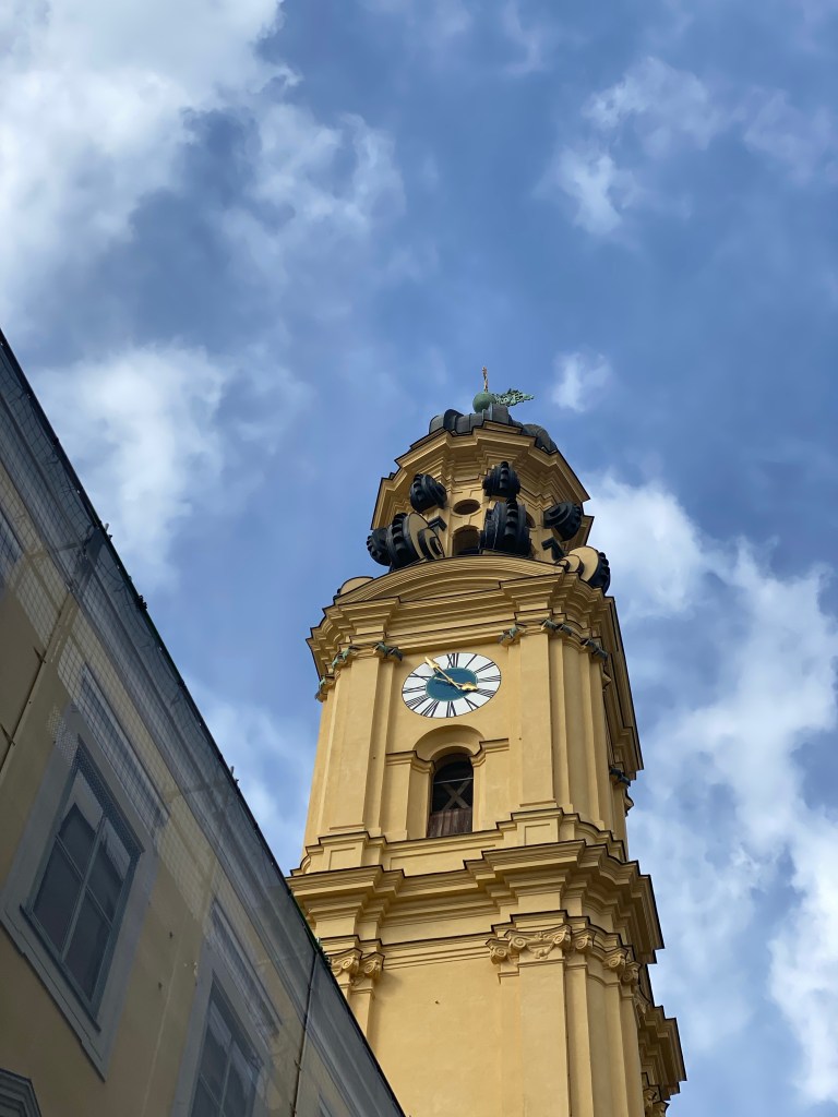 テアティーナ教会の前には、バイエルン軍の記念堂「Feldherrnhalle」があり広場になっています。街中にある教会でもかなりの存在感。正面から見ると高さ71mのドーム、そのサイドには2つの時計塔がデザインされたユニークな外観で、鮮やかな黄色が目を惹きます。