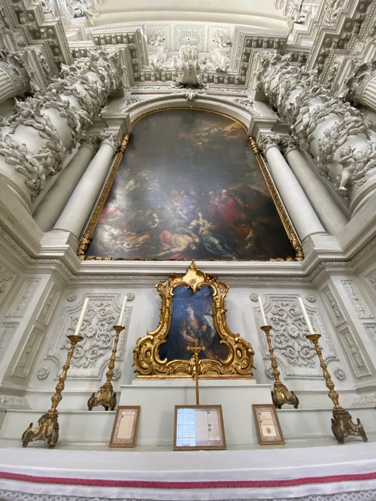現在、バロック式の主祭壇には、1946年の作品で幼子のイエスと聖女を従えたマリアが描かれており、副祭壇も見逃せません。全体的に豪華で美しい漆喰の彫刻がなんとも優雅。ディテールを眺めているとあっという間に時間が経ってしまうことでしょう。